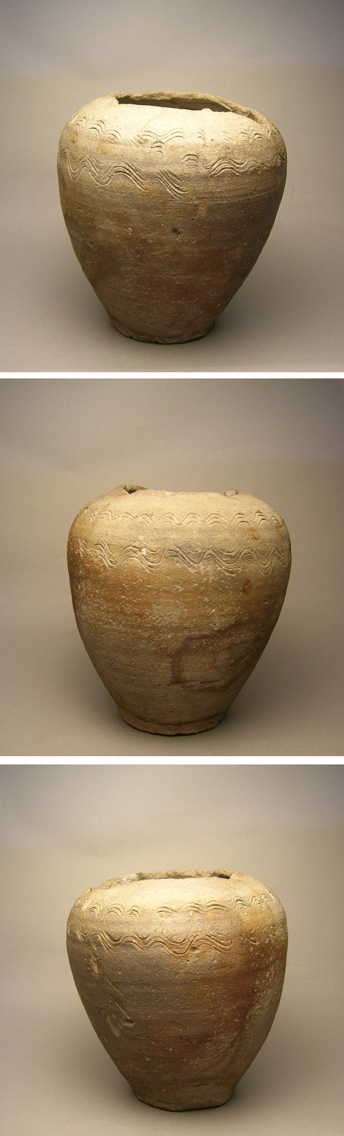 フォルムは、口頸部をきれいに欠失し、張りと丸みの調和する肩から、柔らかな脹らみを残しつつ、底面へとおだやかなラインを描いていきます。