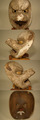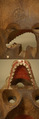 下顎部分が無くなってしまっていますが、これは口にくわえて動かせるようにしていたようです。目には金泥が塗られ、単なる動物ではなく、超常的な存在を表現しています。眉間や裏側のノミ痕など作者の力量が覗えて、とても豊かな表現力を持った面です。