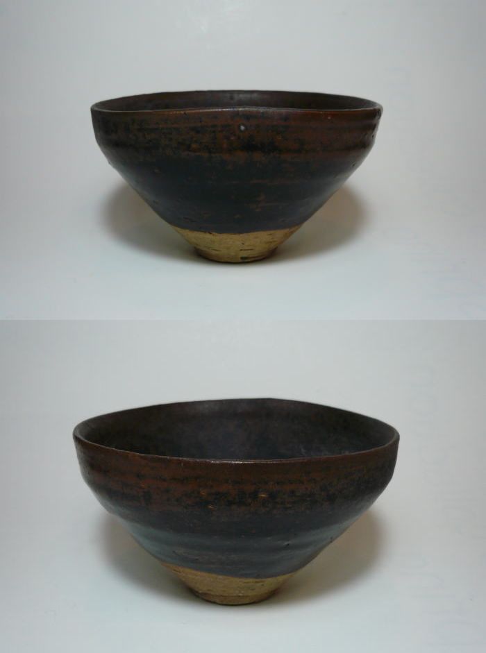美濃で焼かれた天目茶碗です。口辺に多少の歪みが御座いますが、作為の無い「ゆがみ」ですので、濃い色合いの鉄釉と共に、味わい深い雰囲気を演出しております。この天目でお薄を頂いてみましたが、茶のグリーンがとても良く映ります。鉄釉の変化でしょうか、黒釉と褐釉が織りなす内側の景色もご堪能頂ければと思います。一部カセが御座いますが、これも時代を経た証しとご理解頂ければと思います。