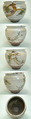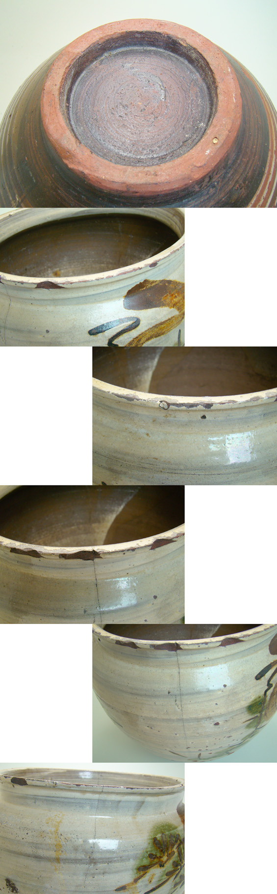 口縁からニュウが2本、その他、ひっつきや、削げ、釉剥けはたくさんあります。しかし多くが生活雑器として使われてきたことを考えると疵が多いのは致し方ないところと思います。ニュウはこれ以上広がらないよう、止めてもらいました。 |