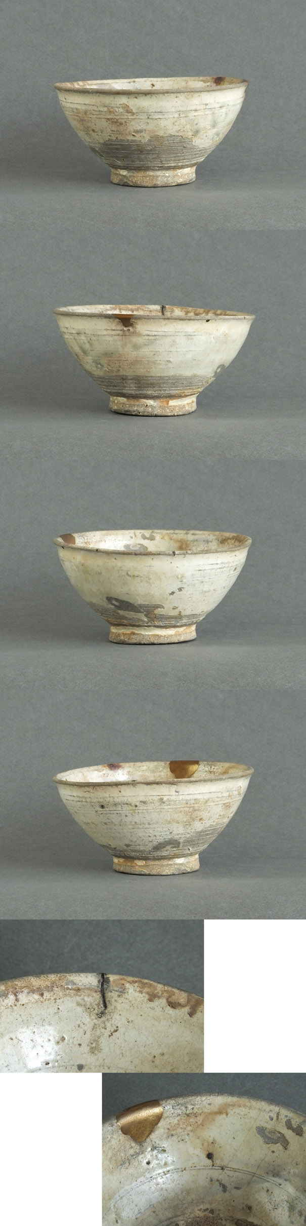 上記文中にある白泥の剥離のほか、口縁に金繕いとニュウが3本、窯疵に漆を入れて留めた部分がありました。