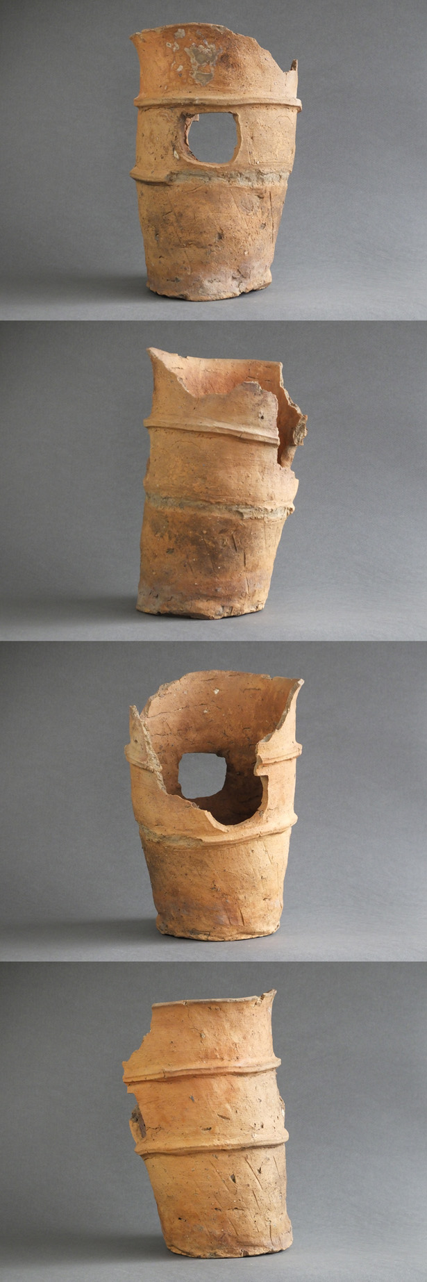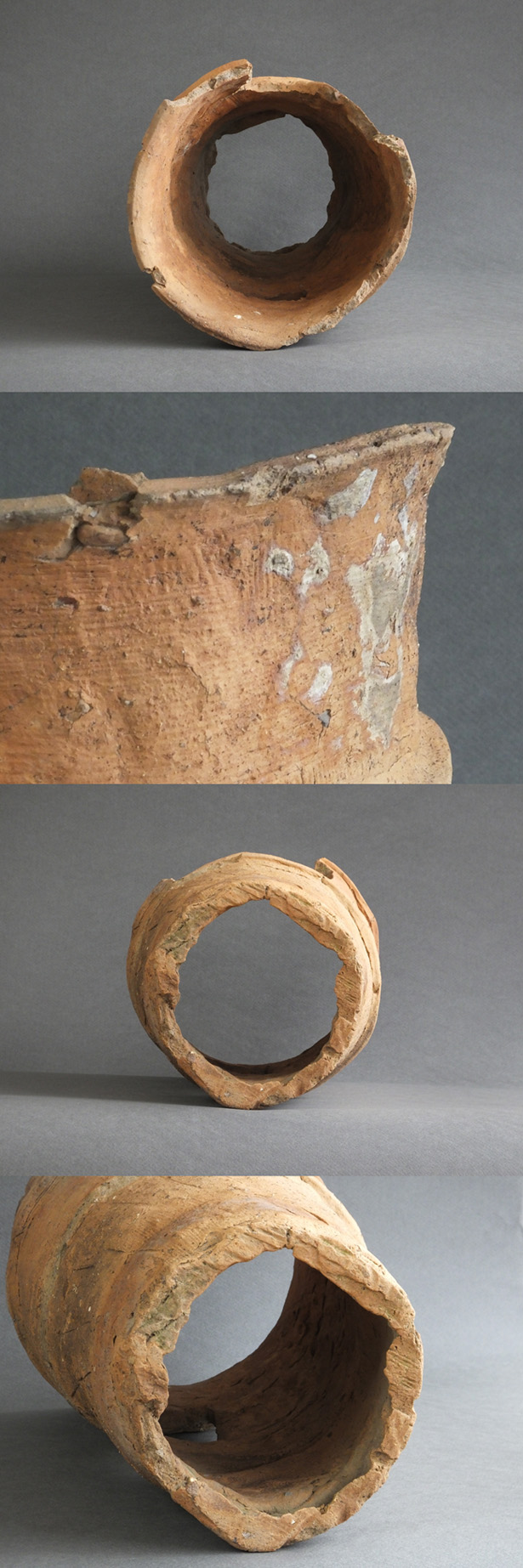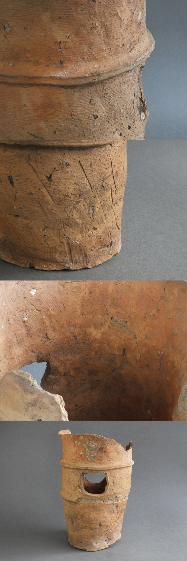 発掘ものの土器であれば破損は避けがたいこと、これも欠損はありますが口縁部までしっかりと残っている部分がありますので、全体像が想像できると云うのがありがたいですね、穴も普通より大きく開けてしまったためか、上部が突帯に掛かりそうになったので、いびつな円になっているのもまたご愛嬌でしょうか。シャープな張り出しの突帯もきれいですね。