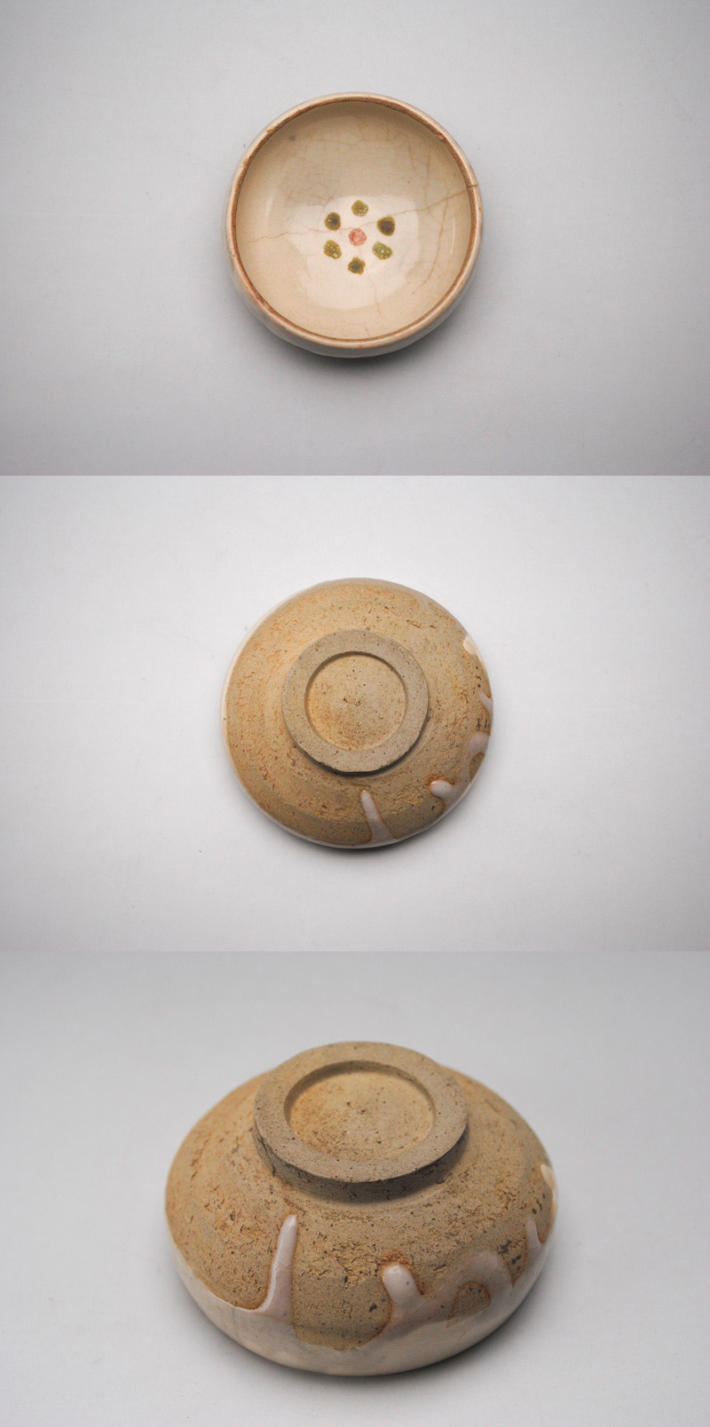 黒花(鉄絵)で描かれることの多い絵高麗ですが、この盃は色絵で仕上げられており、柔らかい肌と相俟ってとても愛らしいものです。見込のニュウは残念ですが裏に通っているのは口縁付近だけですので、無難にお使いいただけます。良質な粉引のようにじんわりと酒を吸い、呑むたび愛着が湧く盃と思います。希少な色絵の絵高麗盃、この機会に如何でしょうか。