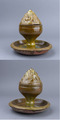 中国後漢時代に焼成された陶器緑釉博山香炉です。博山とは、海中にそそり立つ仙人が住むと伝えられる伝説の山のことで、漢時代から唐時代までの間に好まれて上等品の香炉に使用されて来たモチーフです。「博山炉」と呼ばれ、数十年前は百万とか、場合によっては数百万円していました。中国の開発工事により沢山出土したのでどん底まで安くなった今は逆に安すぎるのでまさに買い時と言えるでしょう。