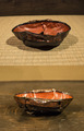 幻とも言える紀元前の中国の漆器です。本作品は今から約2000年以上前、戦国時代から前漢時代に制作された漆器の耳盃です。当時は、飲み物を呑むために用いられていました。通常はもっとシンプルな文様装飾、もしくは無文が大半なのですが、本作は黒漆の本体に多色の色漆を用いて、伸びやかに跳躍する鹿をメインモチーフに描き出しています。その周囲をダイナミズムに溢れ、鬼気迫るとも言える鮮やかな紅の幾何学文が彩り、破綻の無いそのデザイン性には神々しさを感じます。