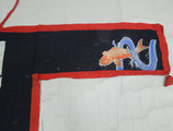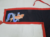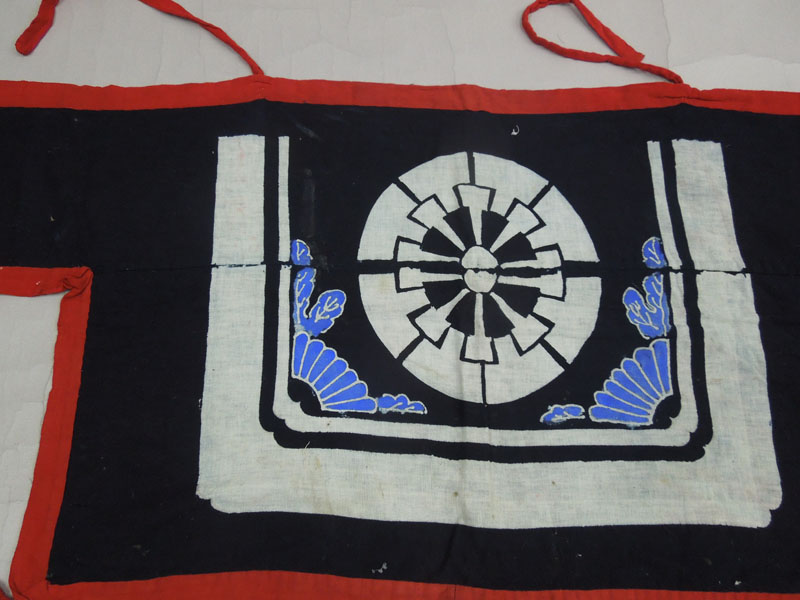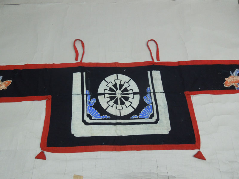 木綿で作られた馬掛けです。家紋は源氏車の模様で左右に急流に鯉の図です。サイズは左右の巾が大きい所で198センチ、家紋の部分がタテ58センチヨコ88センチです。