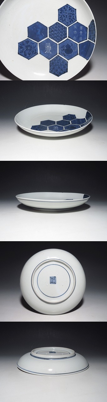 数ある藍九谷作品の中でも、上手作と云えるお皿です。藍と余白のバランスも絶妙で、何とも洗練された意匠です。亀甲文の中も、様々な文様が、様々な技法を駆使し、描写されています。素地は、不純物を排除した純白で、深みのある呉須が、より映えています。