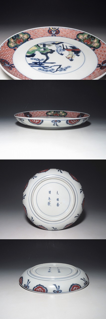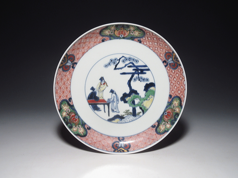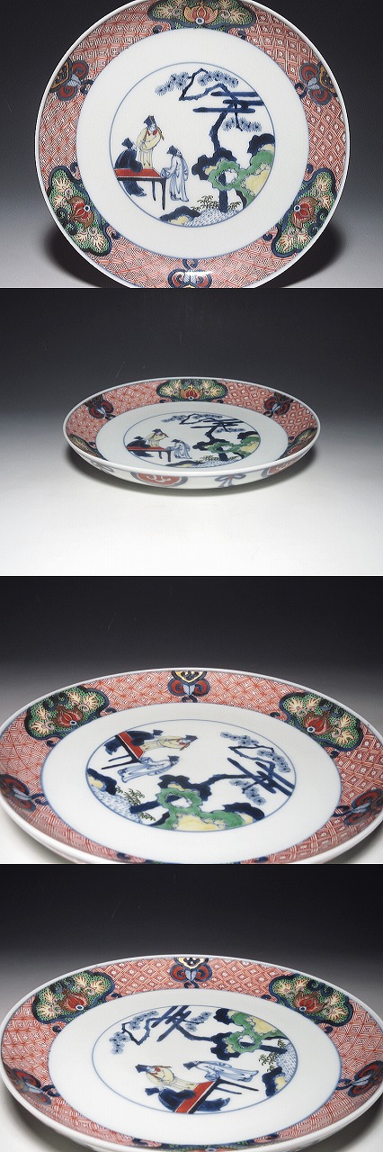献上手にも準じる、最高ランクの染錦作品です。この意匠は、丸鉢では見かけますが、平皿は、ほとんど、見た記憶がありません。3種の地模様も、七宝文、四方襷文、雷文と細密に描き分けてあります。裏絵も、実によく工夫されています。至高の色絵技巧をご堪能頂ける一枚です。