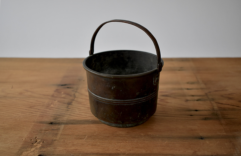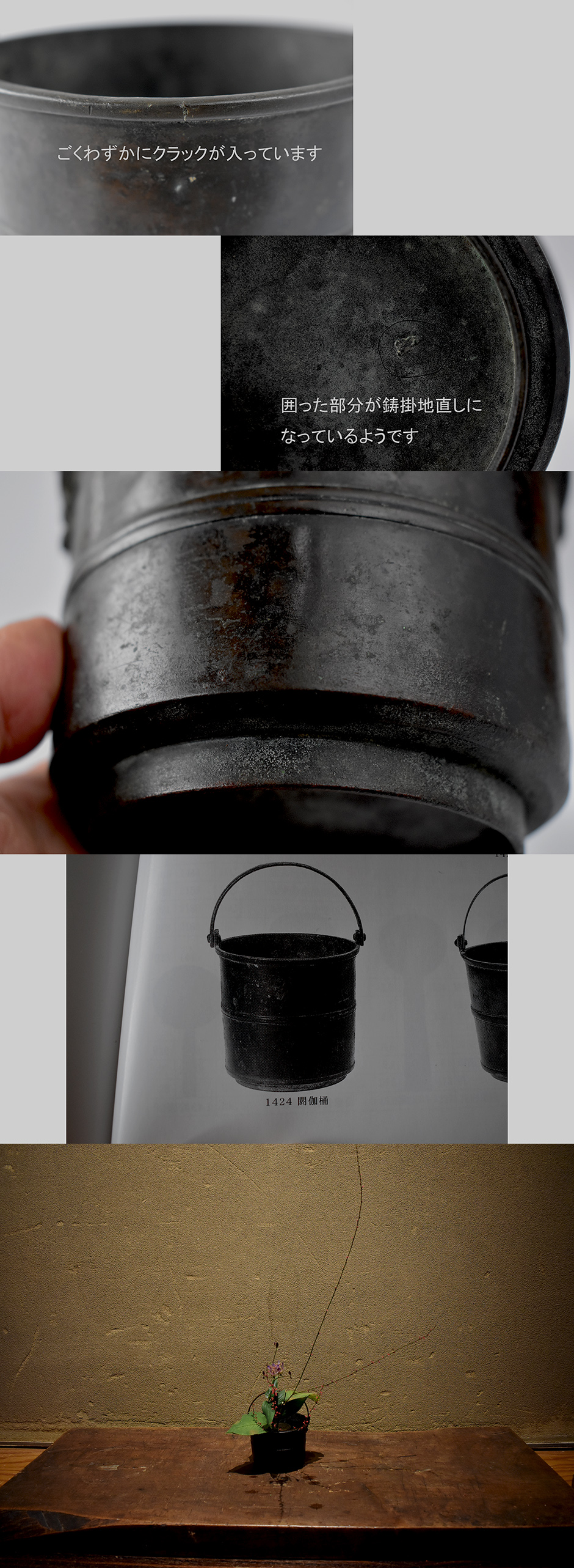むかしから好事家にとっては好ましい花器として喜ばれるもので、持ち手を活かして吊っても面白いでしょうし、味のいい敷板、あるいは寺院伝来の古材など使っての置いた状態もまた風情があっていいものですね。