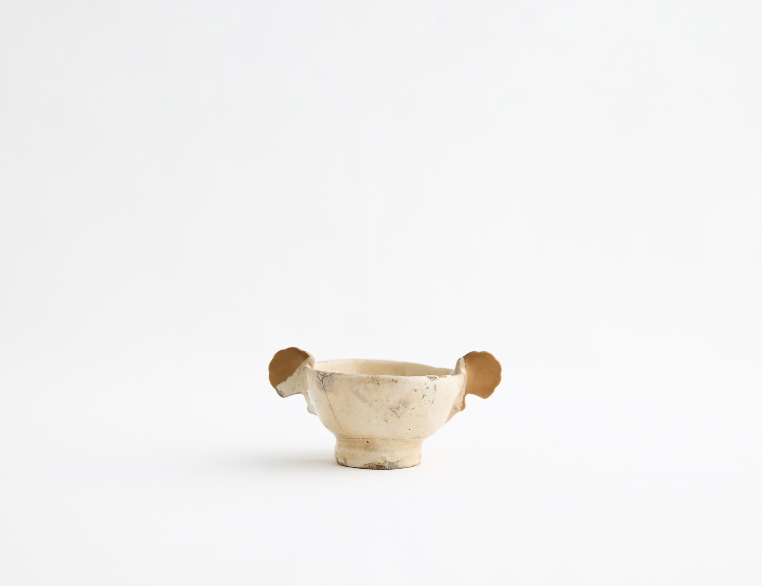 宝城粉引の耳盃です。もともと祭器であるため両耳が欠け金直しされておりますが、おもわず唸ってしまうのはそのサイズ。市井で散見される耳盃は口径10センチを超えるものが多い中、本作は6.5センチと酒盃として好適で、またサイズに比してアンバランスなほど雄渾な高台も見所のひとつです。