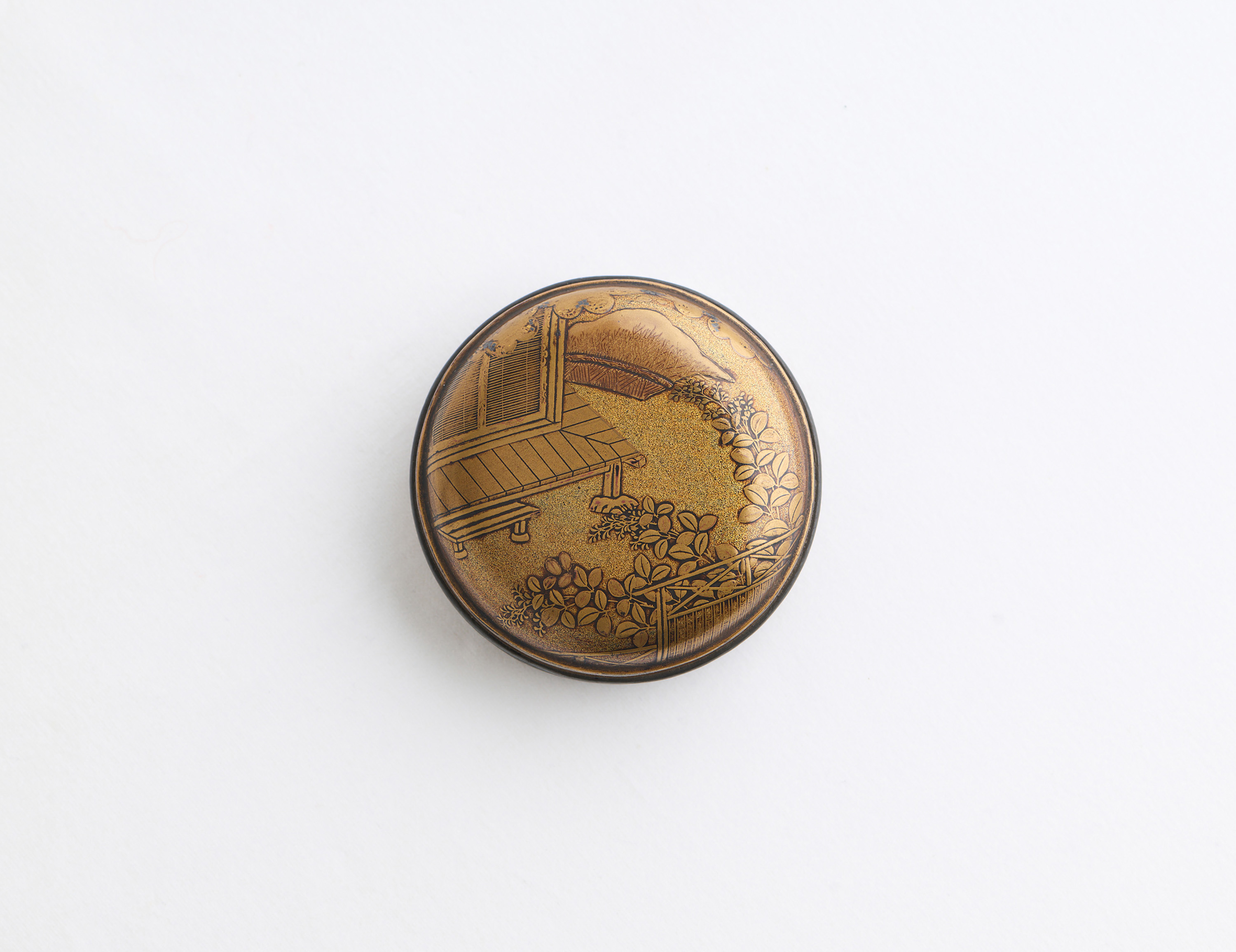 平家物語の小督局(こごうのつぼね *1)を題材にした蒔絵錫縁香合です。錫縁香合とは身分の高い女性のために注文製作された化粧箱の中に収まる小箱を香合として見立てたもので、慶長ごろから茶会で使用されたといわれております(本作のような丸い小箱は白粉容器として用いられました)。