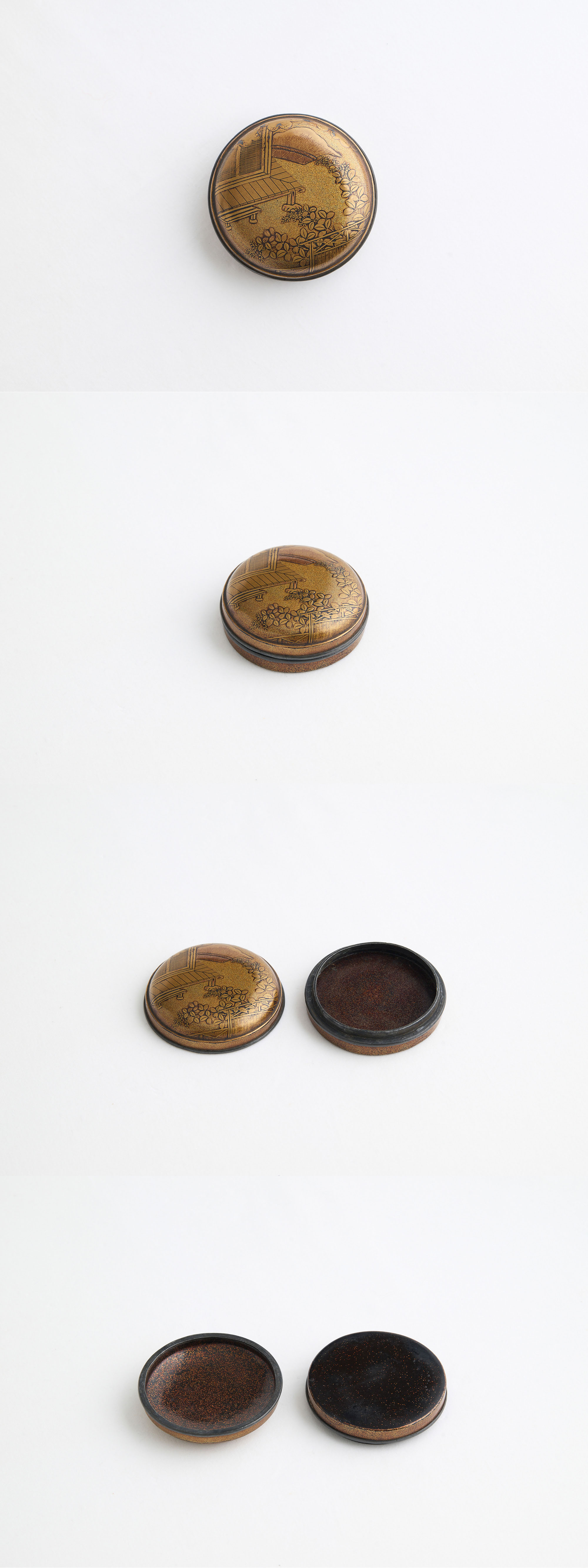 室町期らしい甲盛の蓋部には、梨地を背景に平蒔絵で小督が姿をみせず琴を弾くさまが表現されており、きわめて日本的で静かな情感をたたえております。本体の状態もすこぶるよく、後描きや補修もなく傷みやすい合口の錫もオリジナルのまま。十五夜の風情がちいさな器物に凝縮した、蒔絵錫縁香合の優品といえるでしょう。