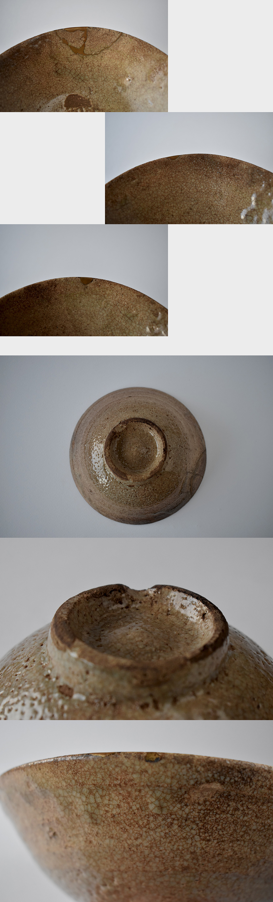 やや浅めの素直な見込みに大きめの目痕が四つ、高台は総釉掛けの丁寧なつくりです。全体の色味は朽葉色というのがちょうど合っているでしょう。そこに貫入が細かく出来ていて味がしみ込んでいますね。かなり早い時期に日本に請来されて愛されてきたのでしょう。