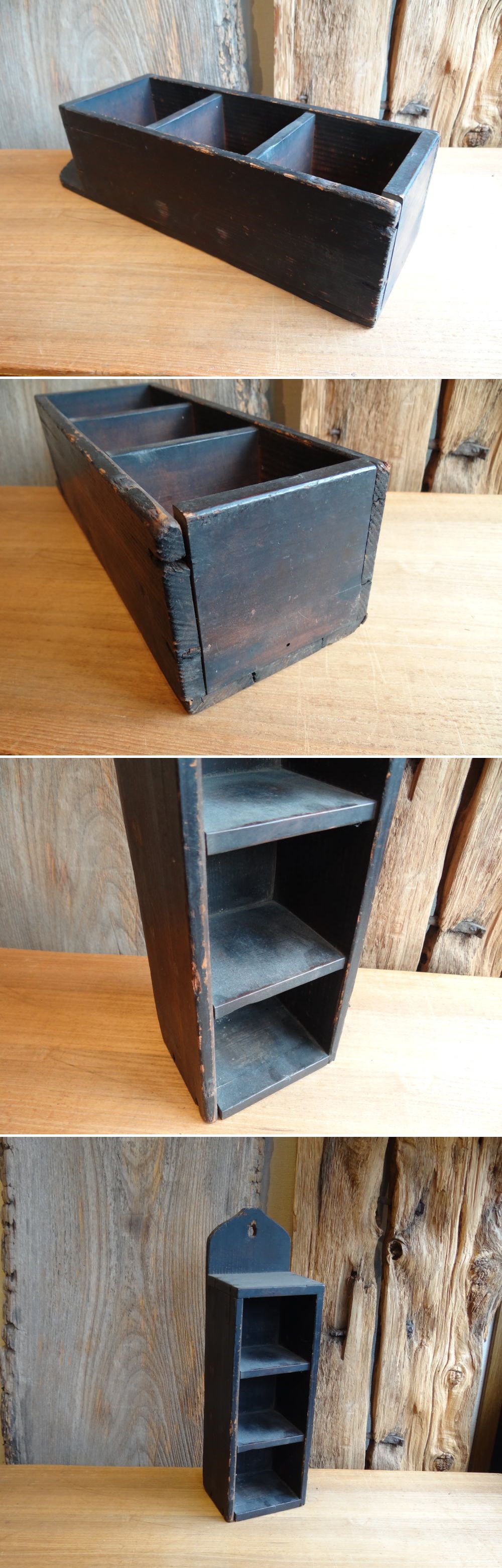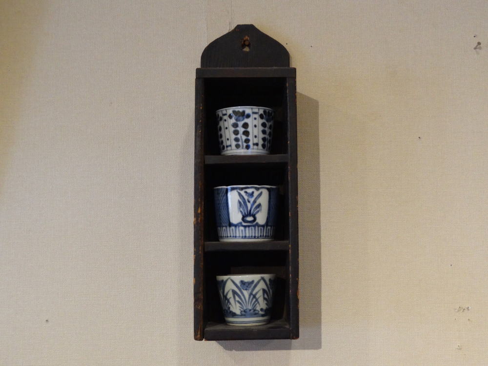 約30年ほど前、東寺の弘法市で購入し店で使用していた「そば猪口棚」です。全く手の入っていないオリジナルの状態です。あの頃はまだ、こう言った物も入手出来ましたが、今はあまり見かけなくなりましたね。壁に掛けられるように穴が開けられておりますし、自立も致します。画像にありますそば猪口は付属いたしません。