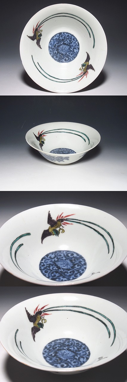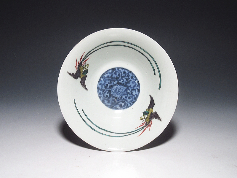 色絵古九谷の平茶碗(小鉢)です。見込みには、蛸唐草文が薄瑠璃抜きで表現され、対の鳳凰が五彩手の色調で描かれています。いかにも古九谷らしい色調と筆致です。