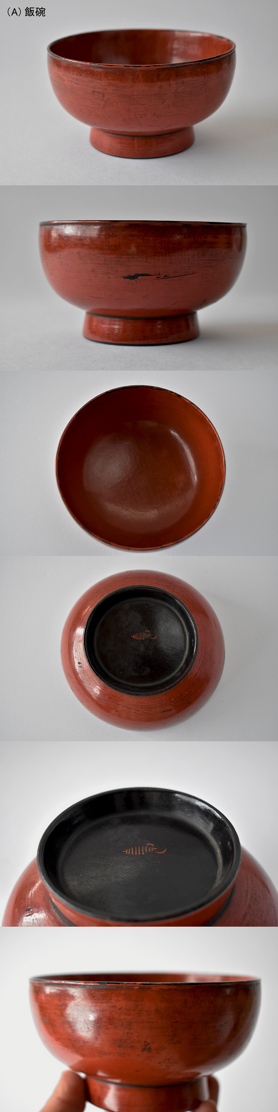 いずれも高台内に苧環のような同一銘が入るもので、珍しい五客一組の椀、収納に便利なように入れ子になって収まります。