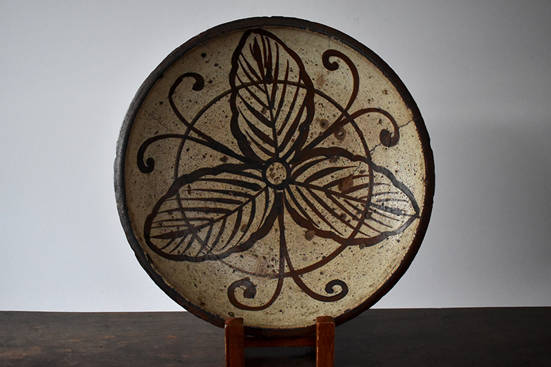 鉄絵具一色で縁を塗りこめ、中心の文様も同じ手で描いています。画面からはみだしてしまいそうなくらい大きく元気よく天衣無縫といったところでしょうか。通常の三つ柏紋の間に蝶々の触覚のようにぐりぐりと線が描き加えられています。筒描きの布などに描いてあるような感覚ですね。