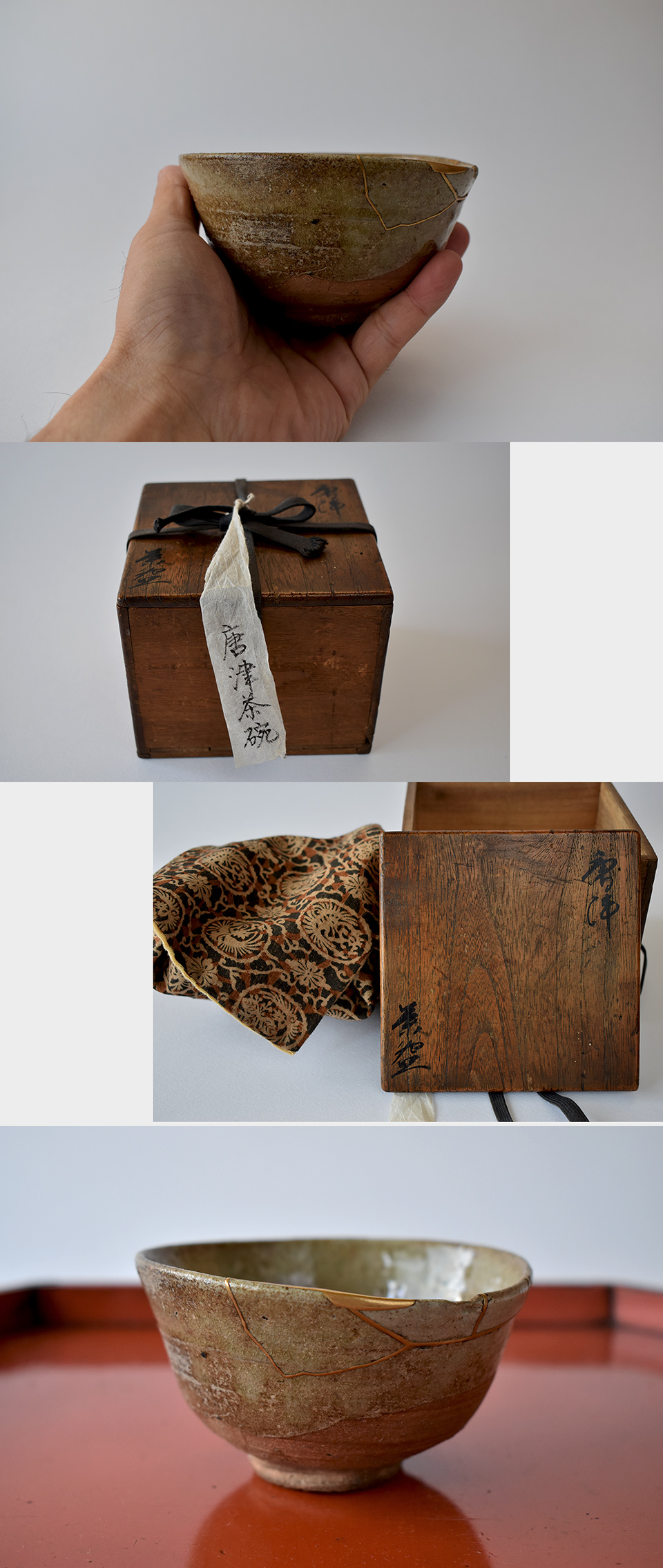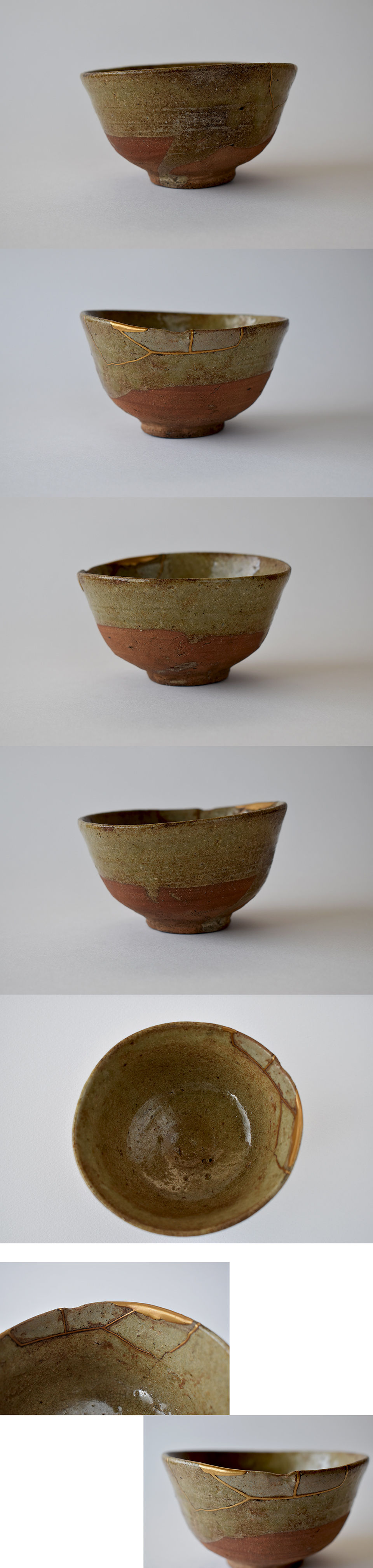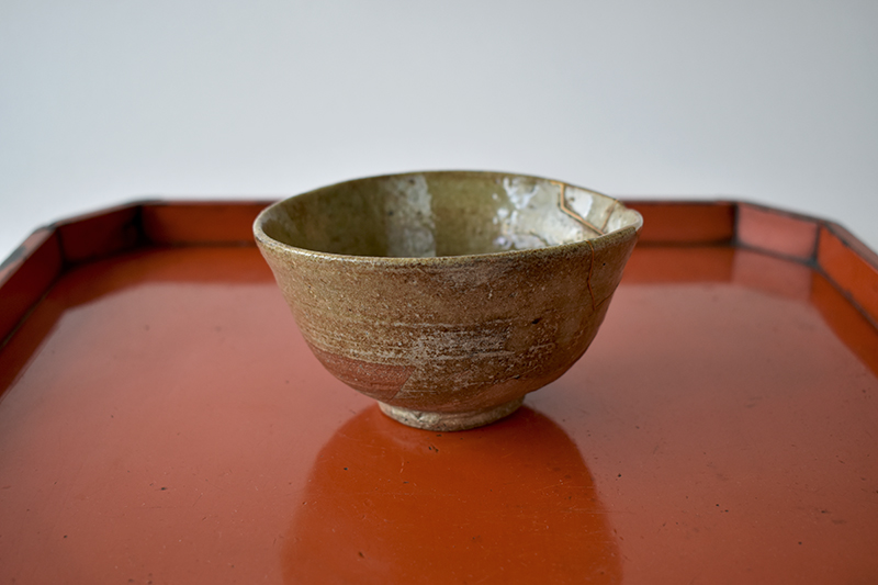 そう思っていた数寄者が過去におられたのでしょう、しっとりとした茶渋がが付いていて愛玩の痕跡が窺えます。金繕いもありますが、この直しも古い時代のいい感じのもの、呼び継いでいますが雰囲気の合う陶片なので違和感もなく、むしろこのいい金色の繕いこそこの茶わんのいい景色とも云えましょうか。