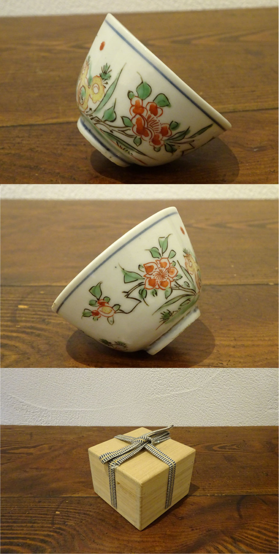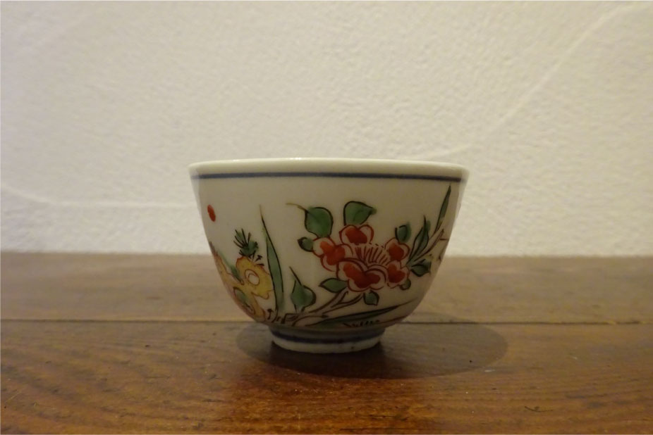 本作は元々煎茶碗として生まれた物と考えています。南京赤絵の煎茶碗は余り市場で見かけません。染付に比べて、絶対量がかなり少ないと思います。