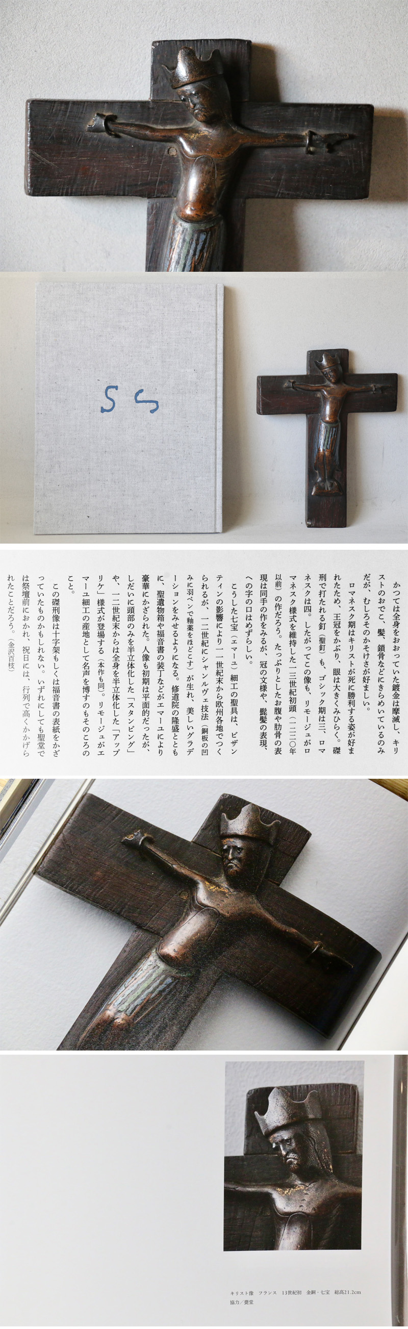 刑で打たれる釘(聖針)も、ゴシック期は三、ロマネスクは四。したがってこの像も、リモージュがロマネスク様式を維持した一三世紀初頭(一二二〇年以前)の作だろう。たっぷりとしたお腹や肋骨の表現は同手の作をみるが、冠の文様や、髭髪の表現、への字の口はめずらしい。