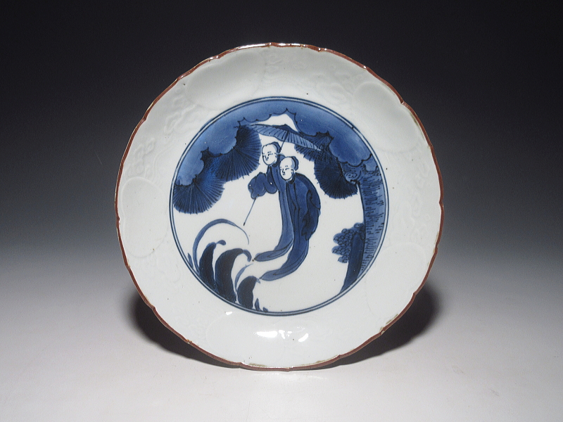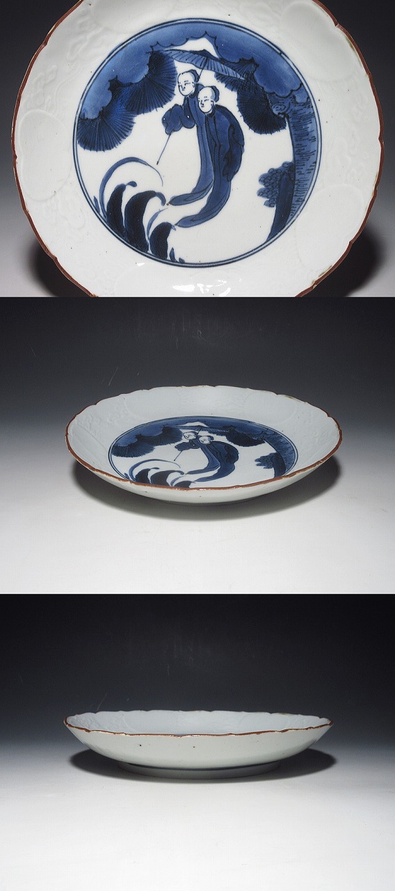 藍九谷で、この意匠は、ちょくちょく見かけますが、縁に陽刻が施されたものは、当方も初見です。通常の傘唐人文は、このお皿の陽刻がないものか、陽刻がなく、二重圏線の部分が七宝繋ぎ文もになっているものと思います。陽刻は、藍九谷の十八番ですので、よく見かけますが、陽刻と傘唐人の組み合わせは希少品で、是非、コレクションに加えて頂きたい一枚です。