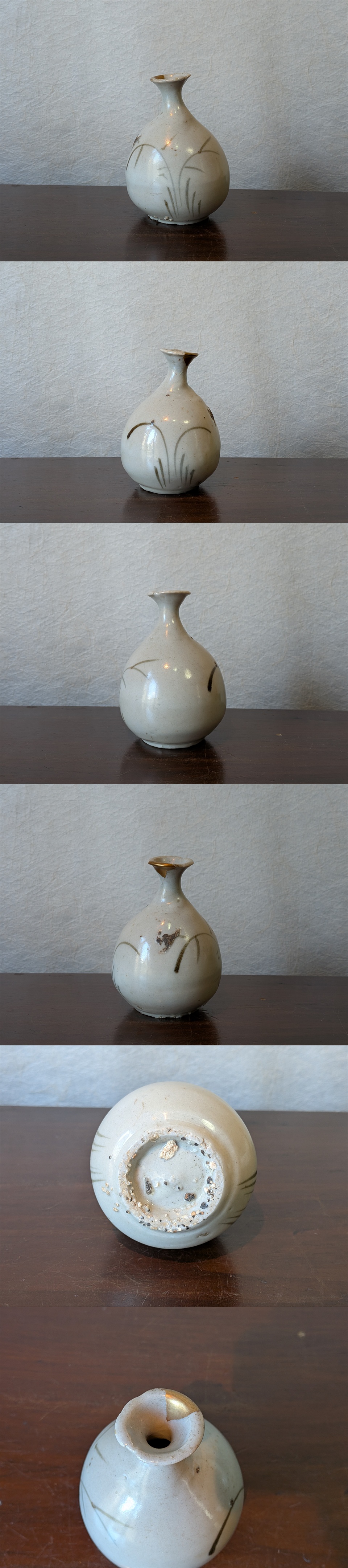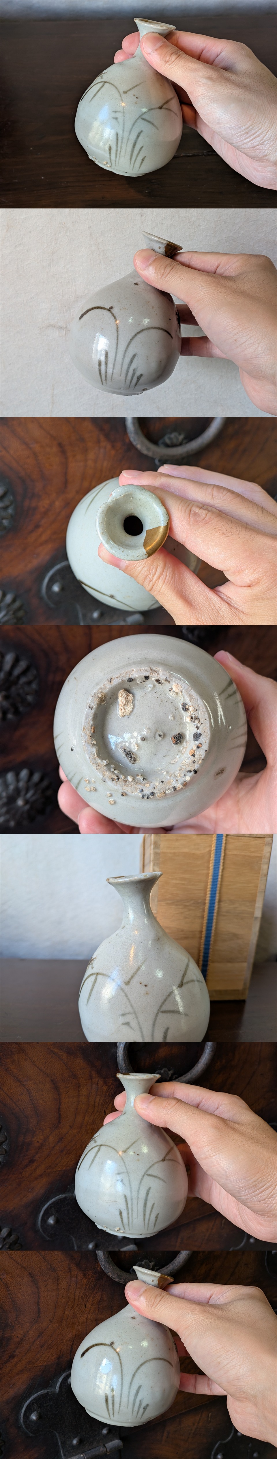 広瀬窯は窯変や首が飛んでいるものが多いですが、当品は口縁の金修理とニュウのみです。