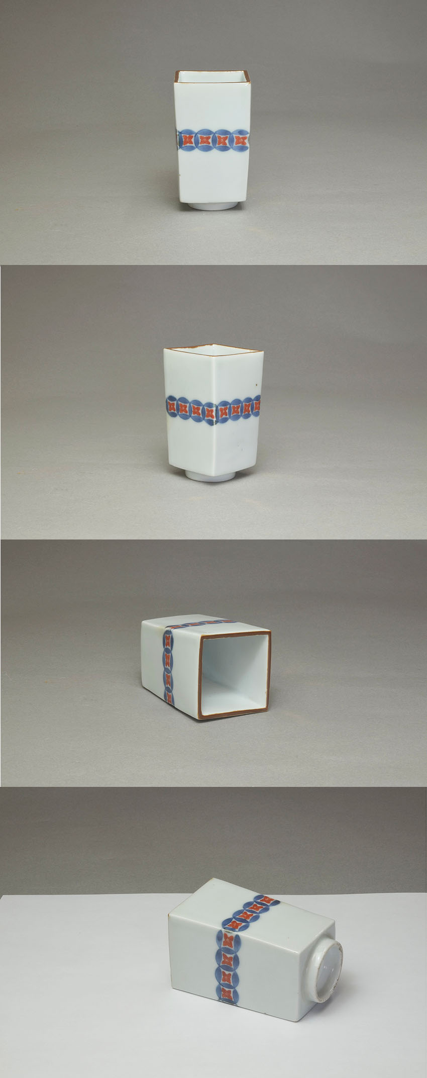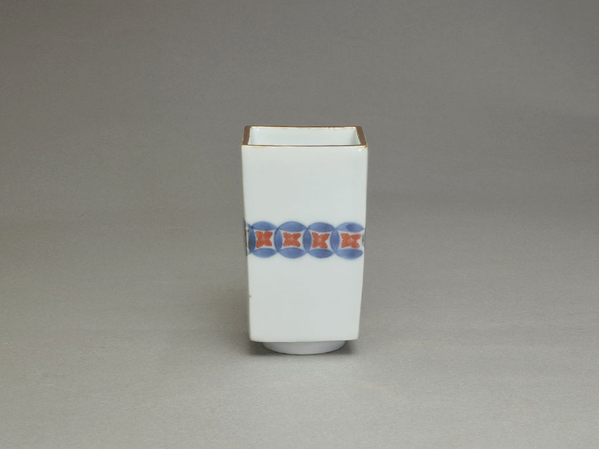 染付と赤絵で胴部中程に七宝繋ぎ文が描かれております。