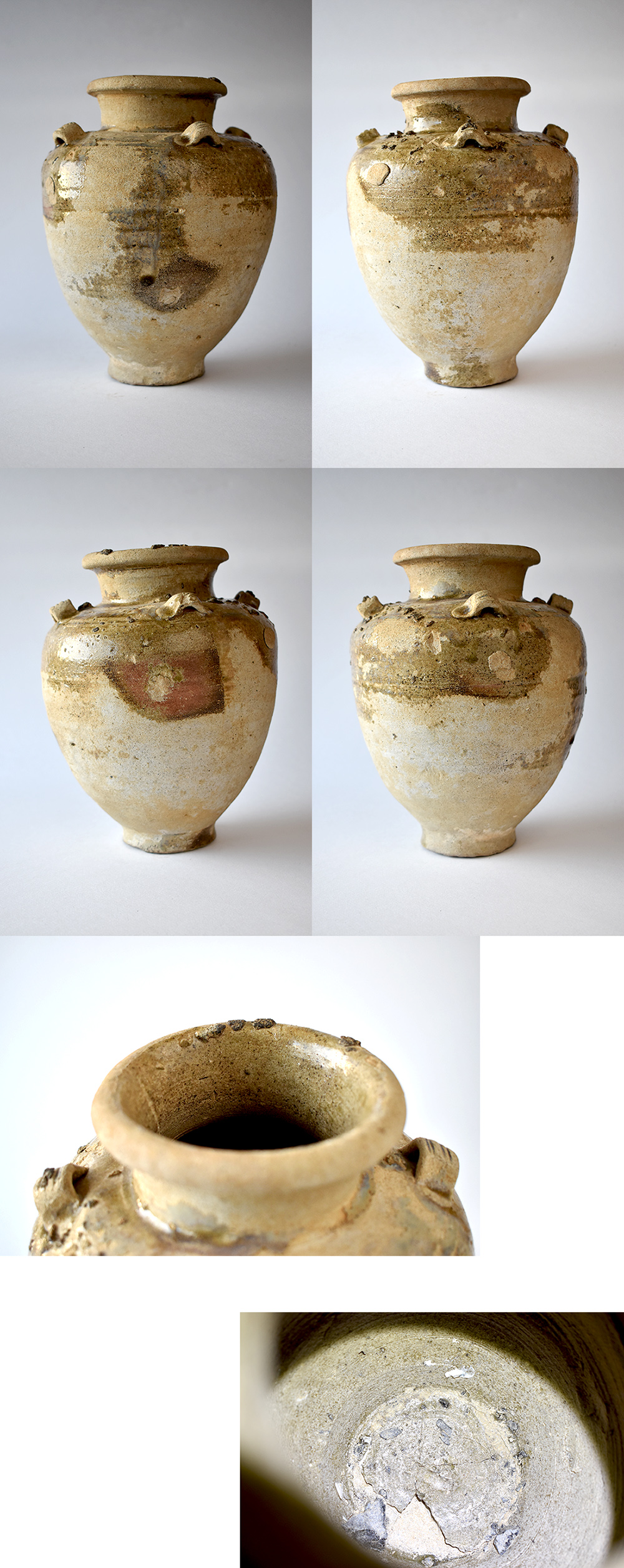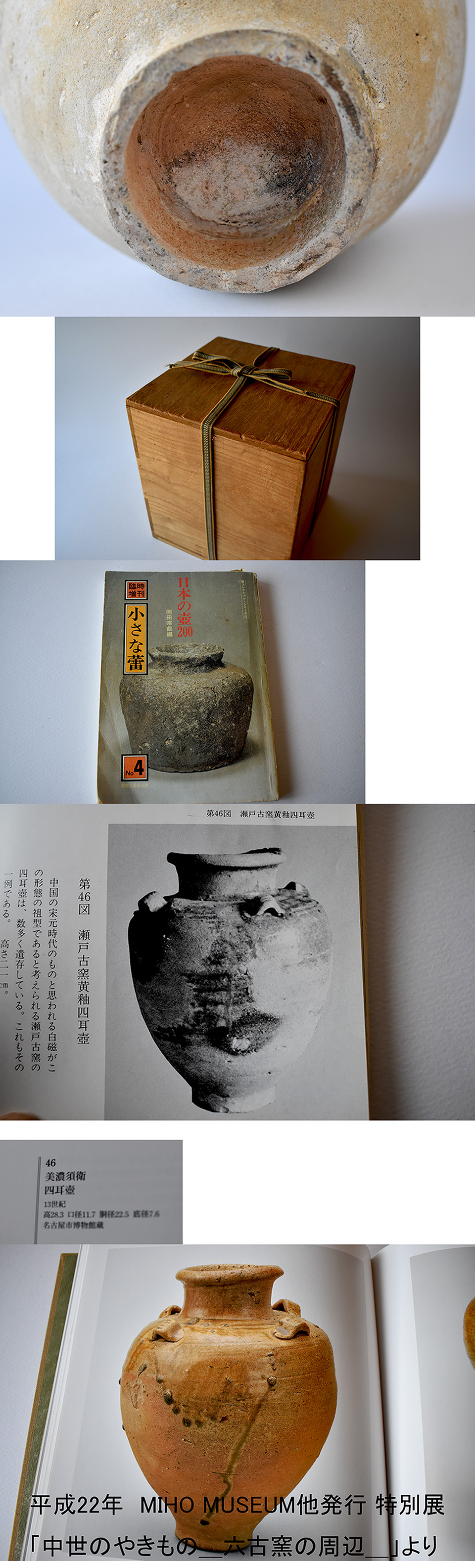 奈良県の某氏旧蔵のお品で、創樹社出版の雑誌、小さな蕾の臨時増刊「日本の壺200」に掲載されている所載品です。本のなかでは瀬戸と紹介されているようですが実際は上記のように美濃須衛古窯であり、こちらは見立違いであったかと思います。また平成22年から始まる巡回特別展、ミホミュージアム他発行の「中世のやきものー六古窯とその周辺ー」の図録に美濃須衛らしさが良く出ている四耳壺がありましたので参考にしていただければと思います。