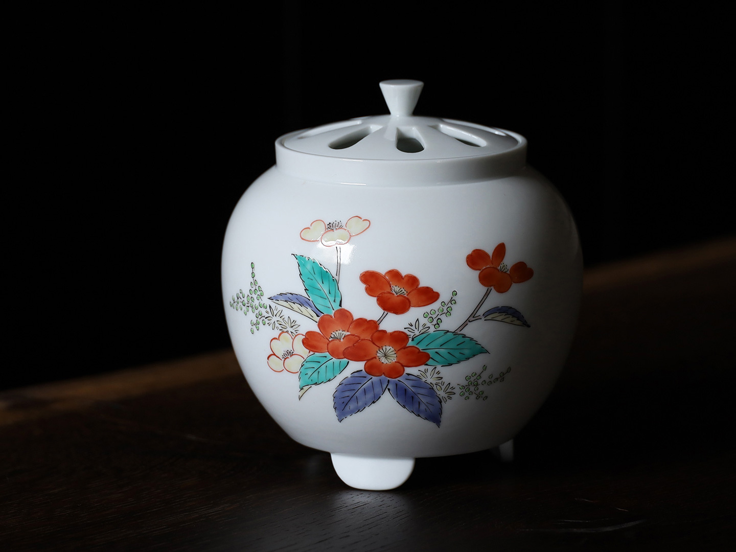 藪手毬文が柔らかみある濁手を美しく彩った香炉です。