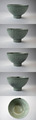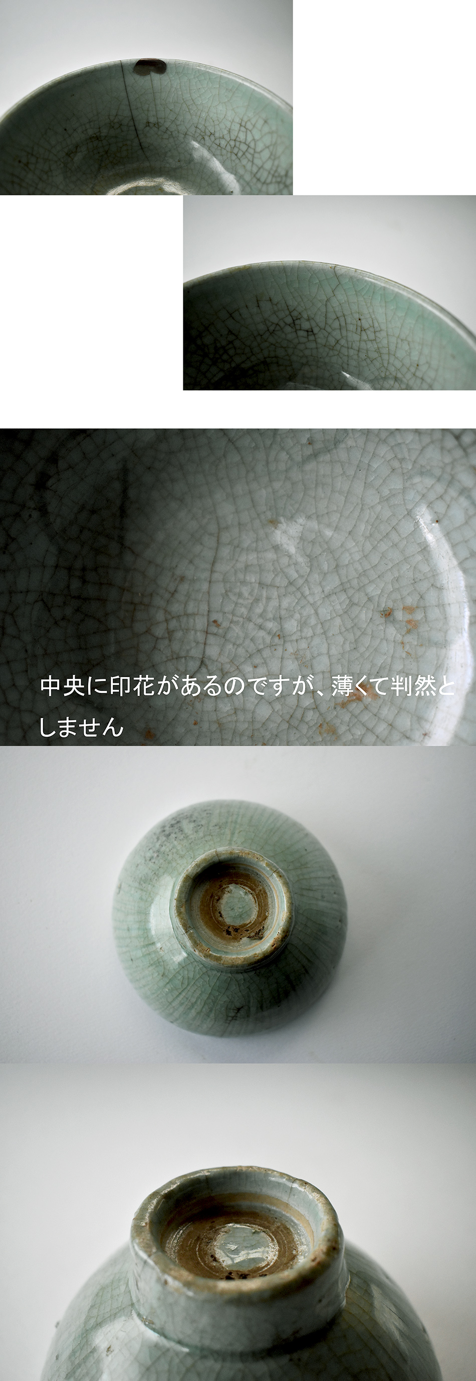 多くは朽ち葉色や暗緑色の上がりがほとんどなんですが、これは青磁発色が薄碧色のきれいな膚であるのがうれしいポイントですね。側面には菊花状の陰刻の連続文が配されて初期伊万里の鎬手のお手本になったかのよう。見込みにも陰刻と印花で文様をつけているようですが、スタンプが薄く何の文様かも判然としていません。もっともこんなラフなスタイルが日本人に好まれた所以でしょうがね。