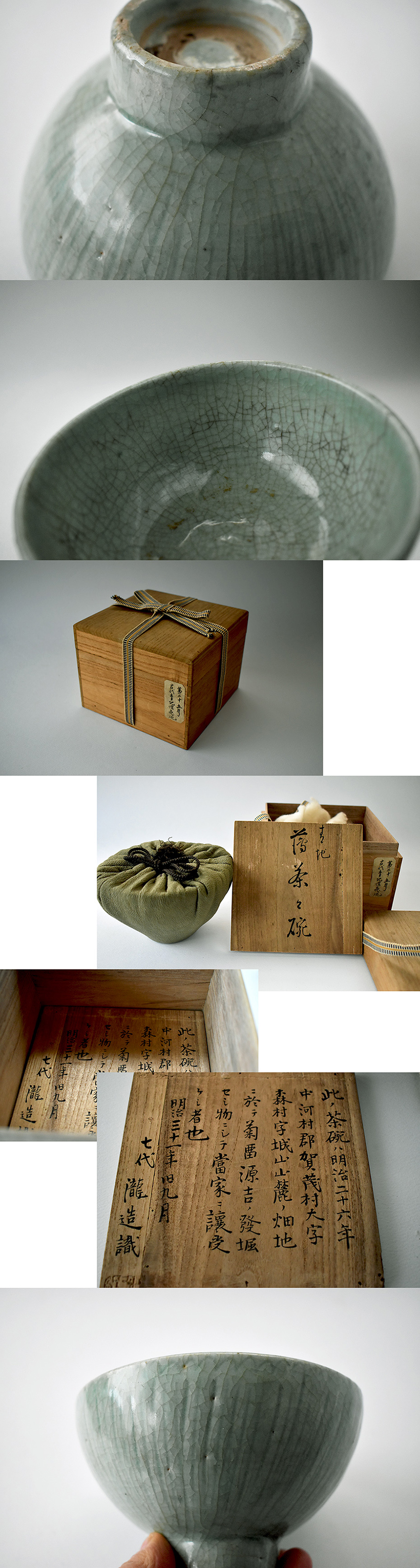 蓋表に「青地 ?茶々碗」とあり、裏には明治26年に発掘されたとあります。中河村郡賀茂村というのは現在の鳥取県