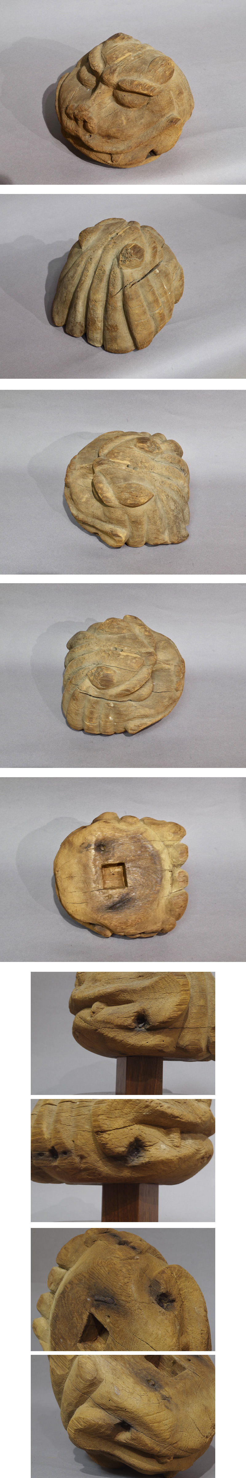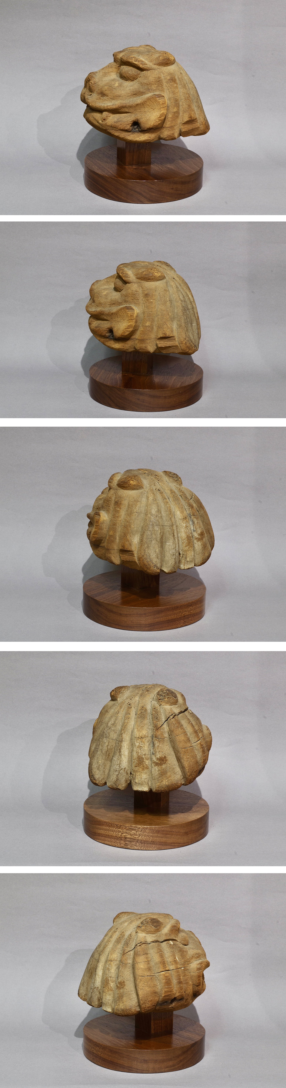 姿勢が分からず頭だけで時代を特定するのは困難ですが、形式化されたバナナの房状のタテガミや静かな面相などから湛慶の流れを汲む 室町時代前期頃の作と想定しています。