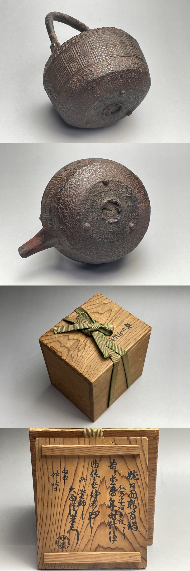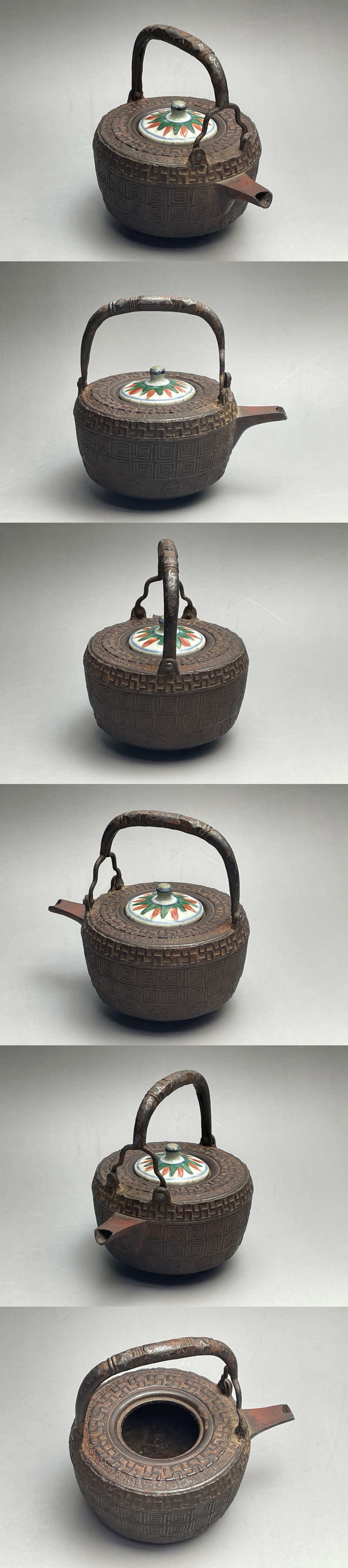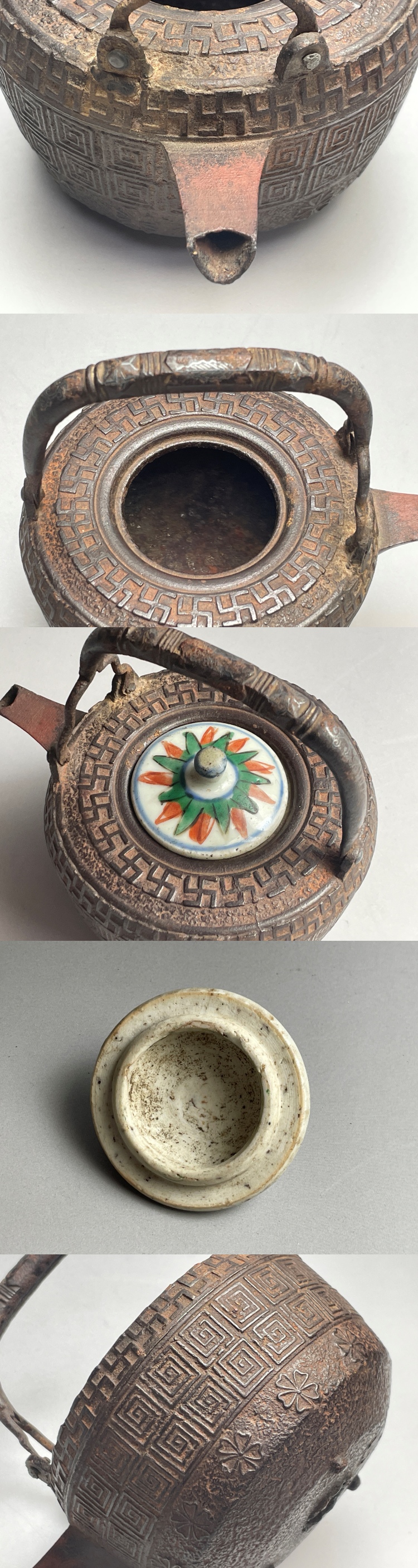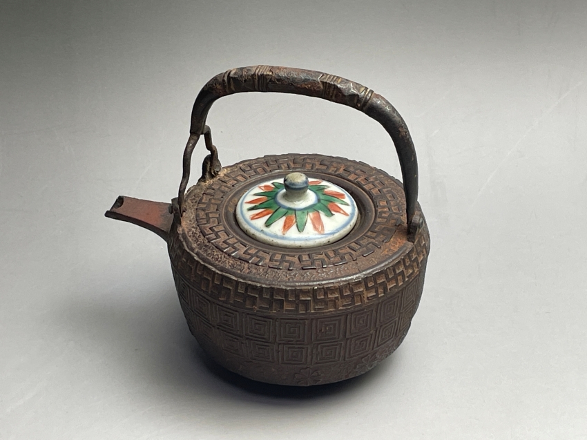 「御釜師 大西清右衛門」の箱書のある燗鍋です。「万字 桜 雷紋アリ 宝暦年時代浄味作...」と書かれているようです。残念ながら共蓋ではありませんが、南京赤絵の蓋が付いています。共蓋より粋になっているように思います。