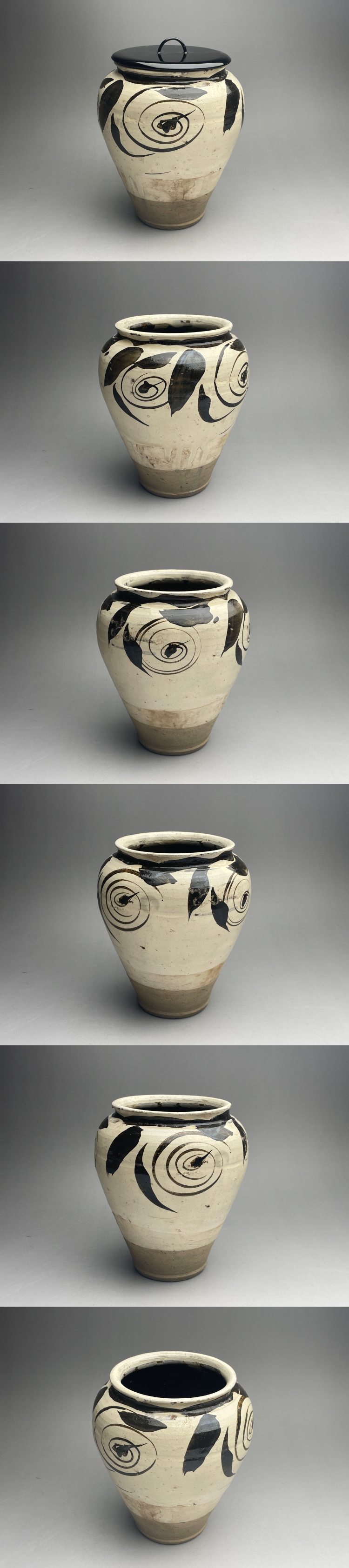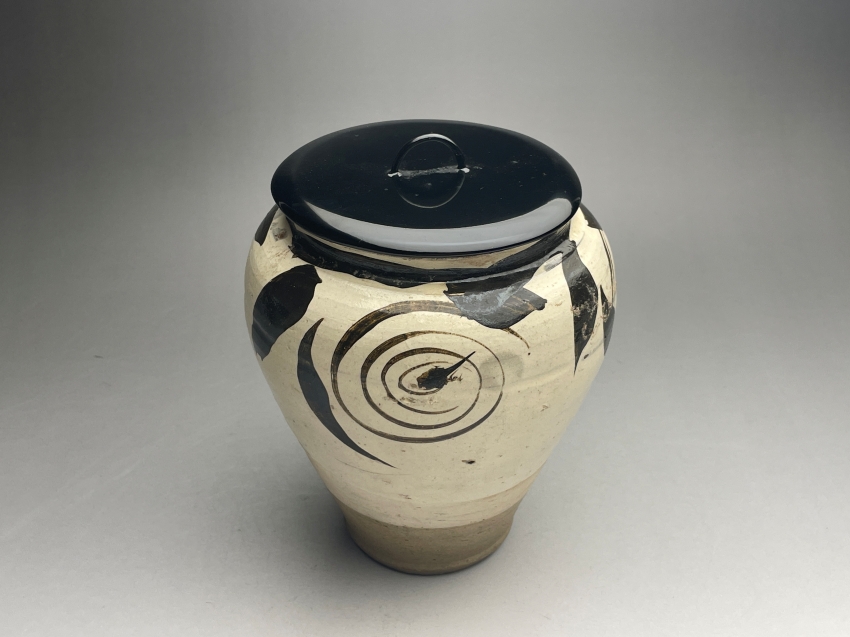 宋から元頃の磁州窯でしょうか。鉄絵で馬の目のような勢いのある模様が描かれています。水指として使われていたのか塗蓋も付いています。