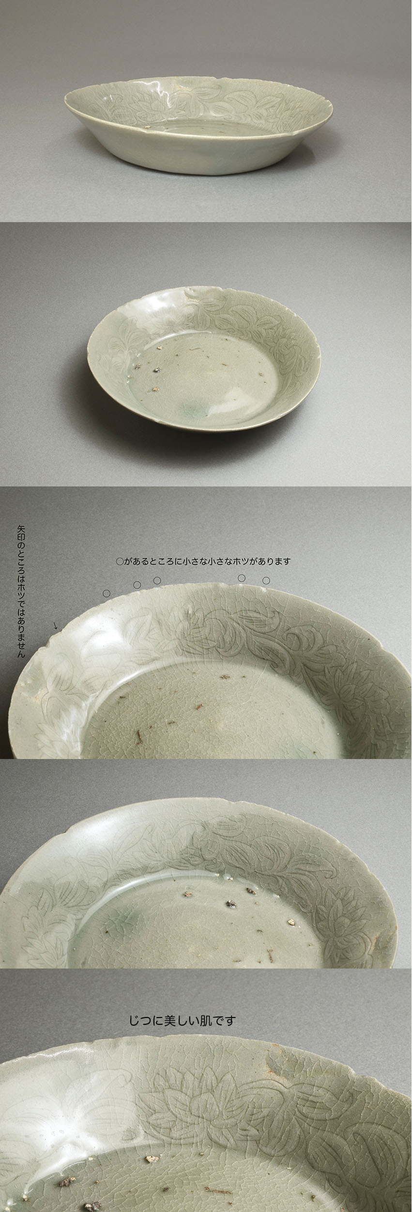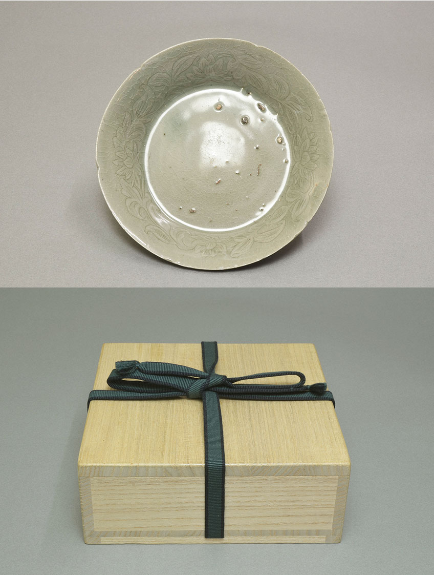 心がキュンとなるような美しい高麗青磁輪花型牡丹唐草陰刻の盤です。