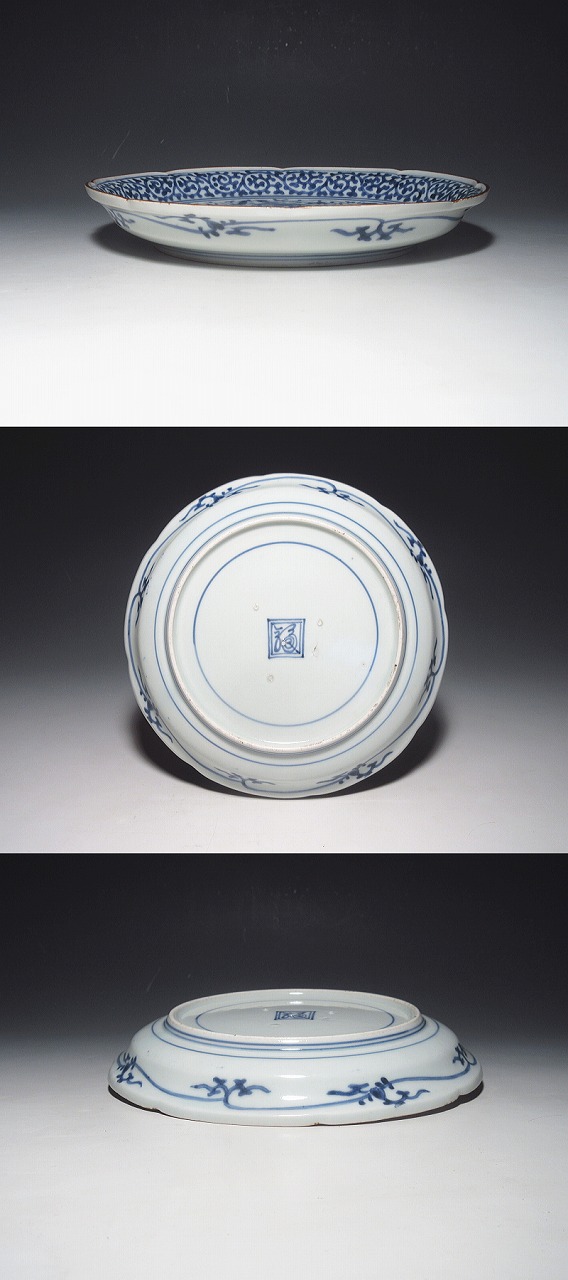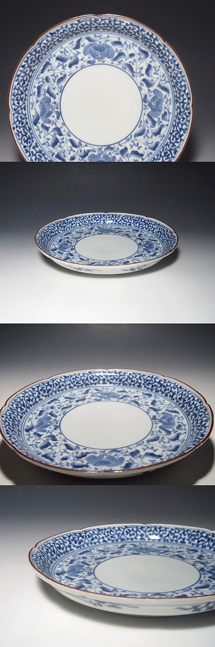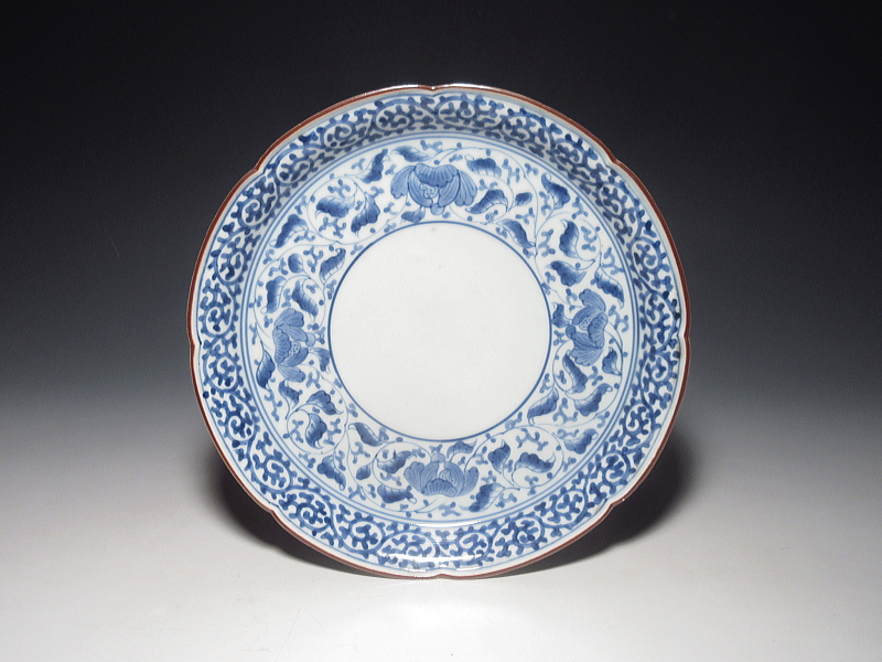 ある立ち上がりを付け、輪花成形となっています。また、口縁には上質の錆釉が施されています。蛸唐草文は、二重線で、美しく描かれ、少し洋風な感じの花唐草文がきれいに発色しています。見込みに何も描かれていないのが洒落ています。器体、筆致、発色、すべてが整っています。