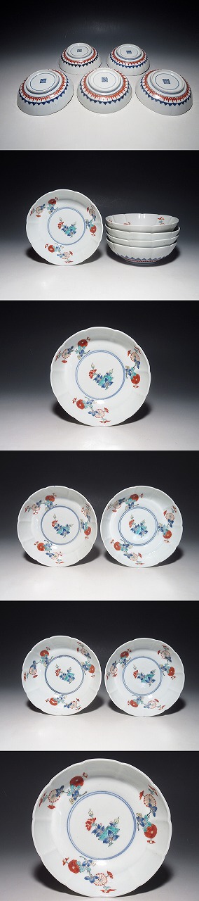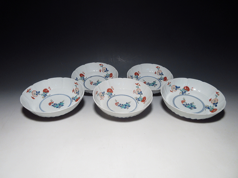 最高ランクの柿右衛門5客揃いです。菊花文に和本が加わり、柿右衛門らしい綿密な筆致と多彩な色使いはいつも