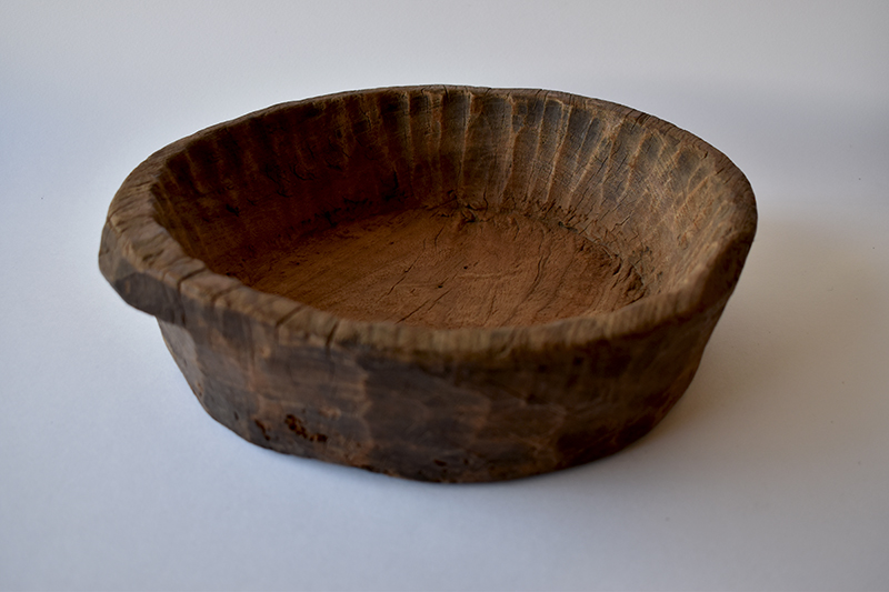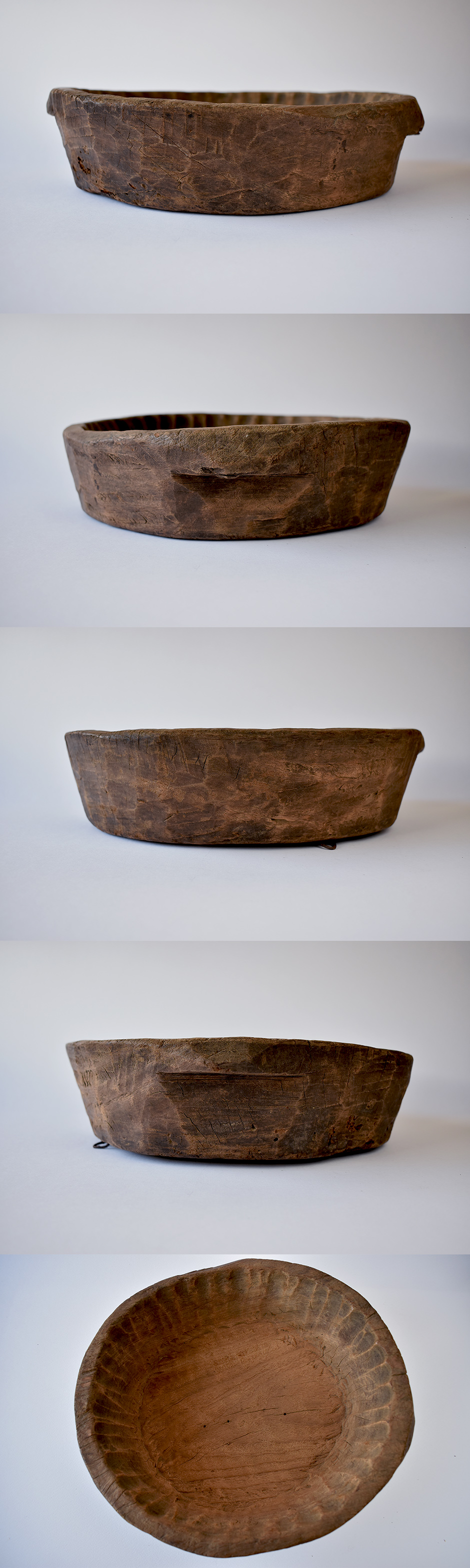 両サイドに持ち手を彫り出した木鉢、見込み内側には日本風の云い方ですが鎬状に鑿を入れたデザインですね。