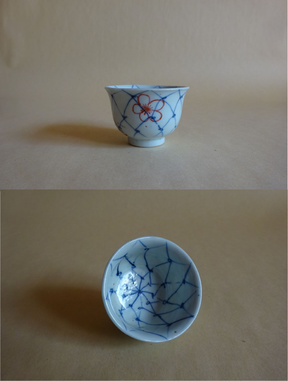 【説明】 新渡の網手盃です。新渡とは新しく日本へ入って来た物を指す言葉です。他にも古渡、中渡りと有ります。新渡はだいたい江戸時代を指しますが、中でも元禄以降と言われています。1800年代の中国は三大帝最後の乾隆帝が亡くなった後の時代です。清朝の力が徐々に落ちていく時代であります。