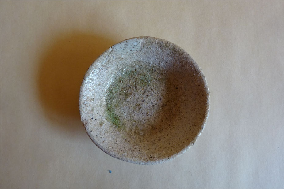 本作は生まれは小皿であったと思いますが、現代では平盃としてお酒を召し上がるのに良い物です。薄っすらと灰釉が掛かり、釉溜りも少しありキラキラとして大変綺麗です。この灰釉が掛かっている物は「天」と呼ばれ、窯の中での積み焼の際、一番上に積んだ物を指します。下の物とは違い表面に灰釉が掛かるのは「天」のみです。その為昔から多くの数寄者が求めた物の一つです。