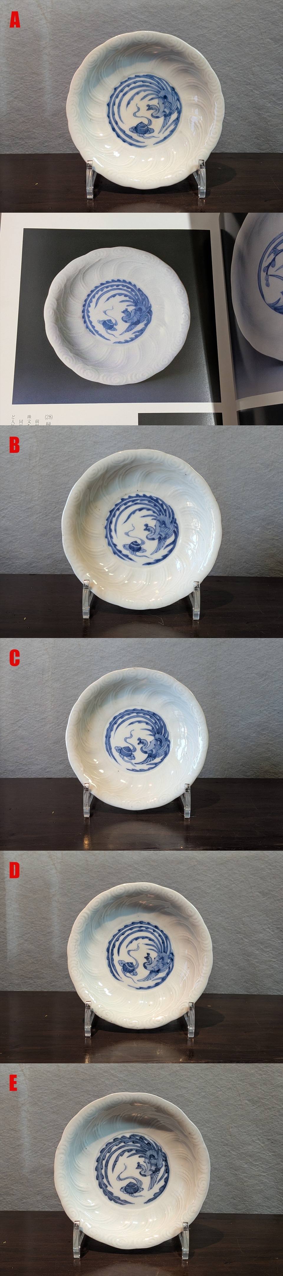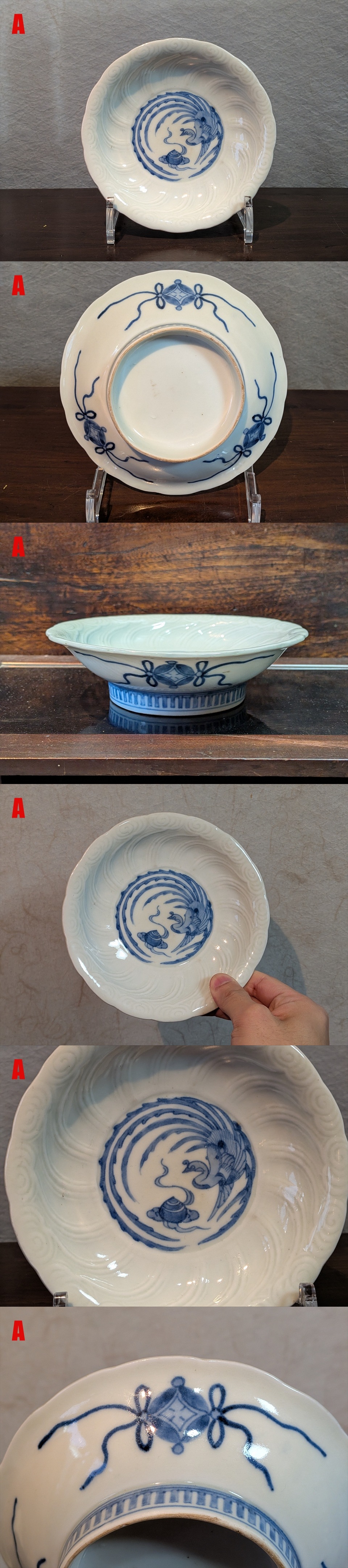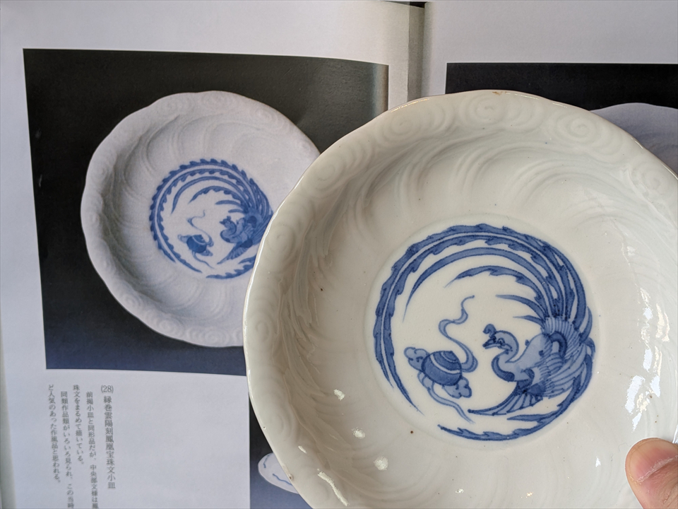 同年代の流行のタイプだったようで、この口縁の輪花と雲模様の陽刻文の皿は同型異図のタイプが複数見受けられます。