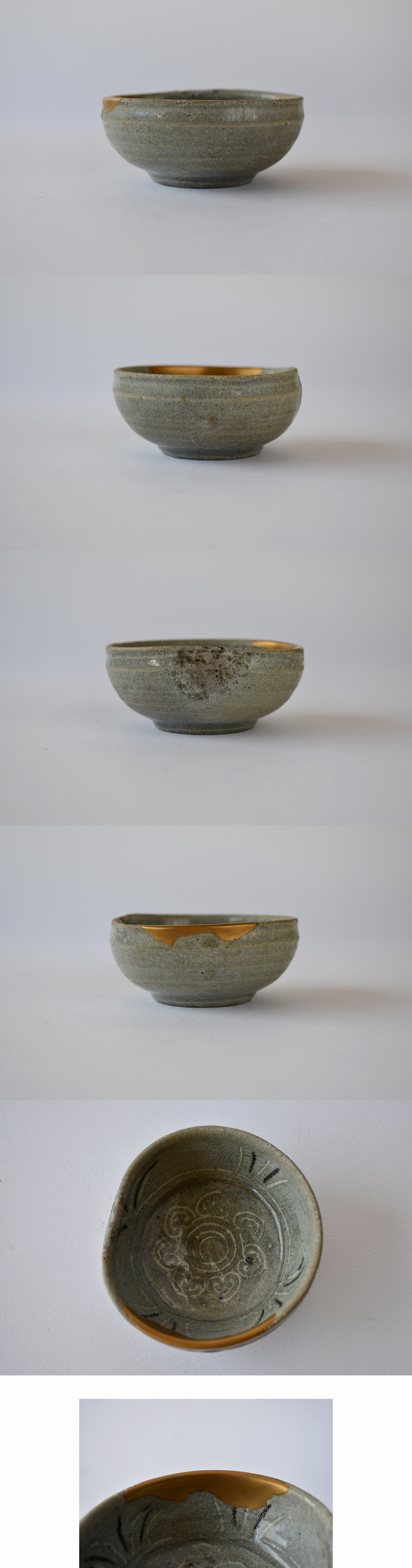 発掘もので、おそらく金繕い部分は降りものが落ちて付着していたんじゃないでしょうか。疵は残念とも云えますがそれよりこの器を活かす為の丁寧な繕いですから良しとしましょう。