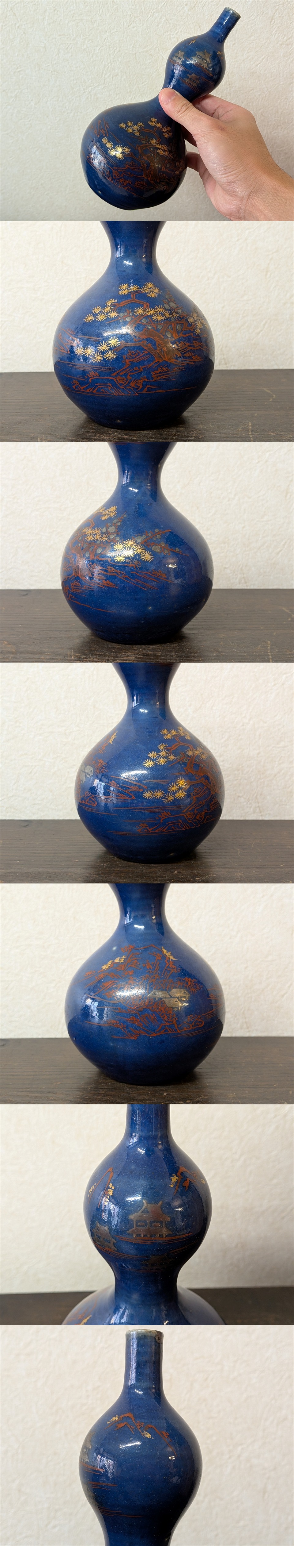 『古九谷 瑠璃釉金銀彩松竹梅家屋図 瓢型徳利』