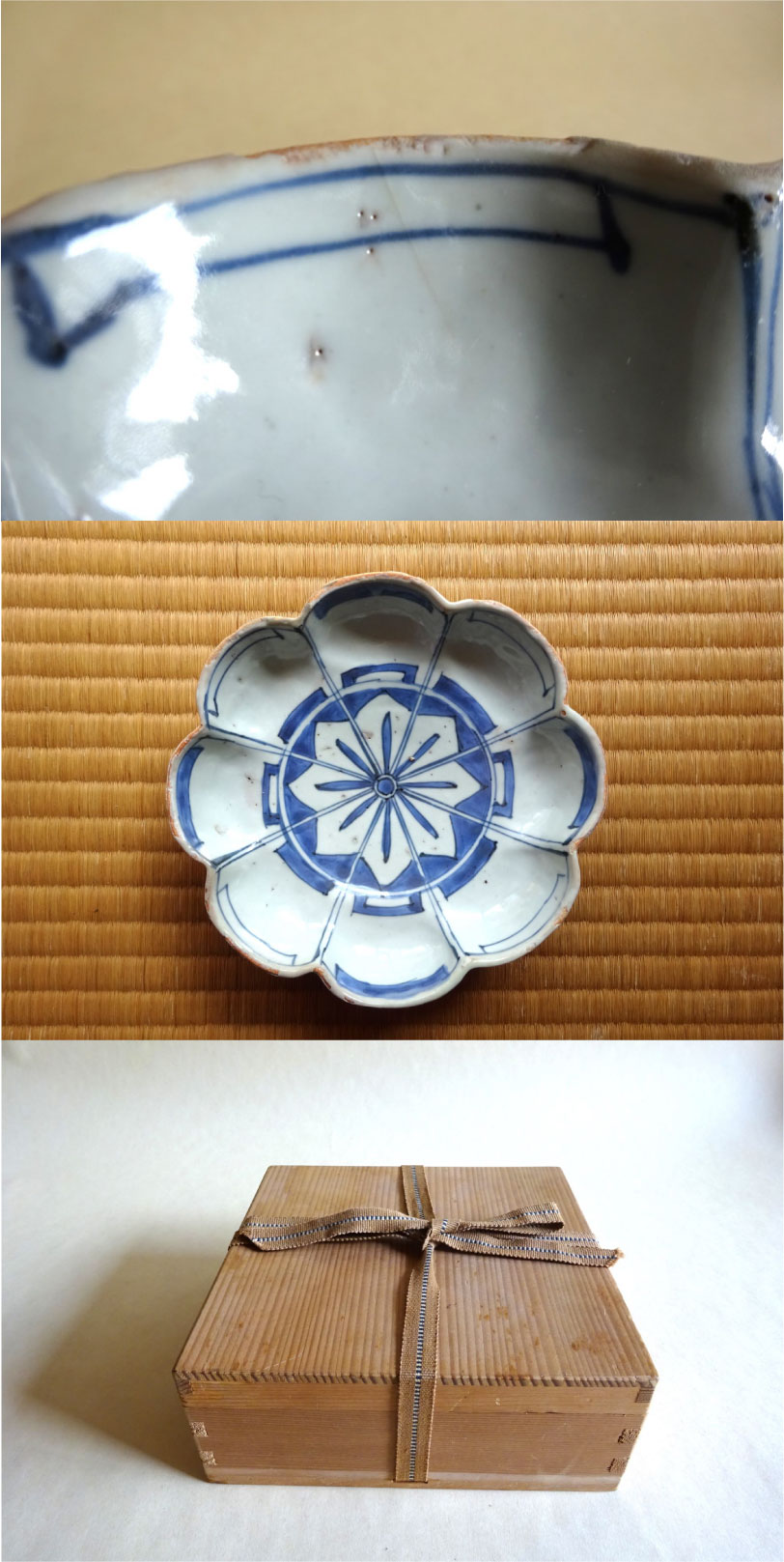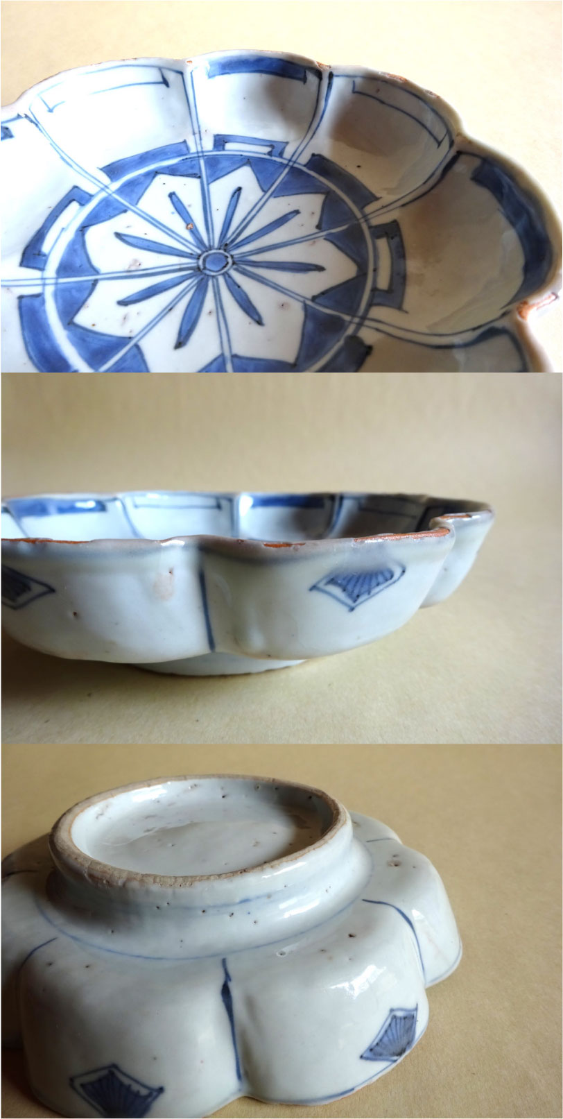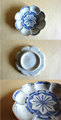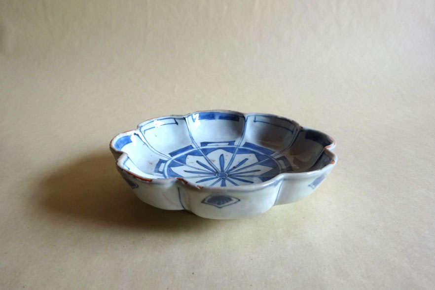 【説明】菊形で見込みには桔梗のような図柄、もしくは矢羽根文を繋ぎ合わせたような向付です。まさに日本が注文したタイプの面白い意匠です。厚手のタイプで非常に魅力的です。