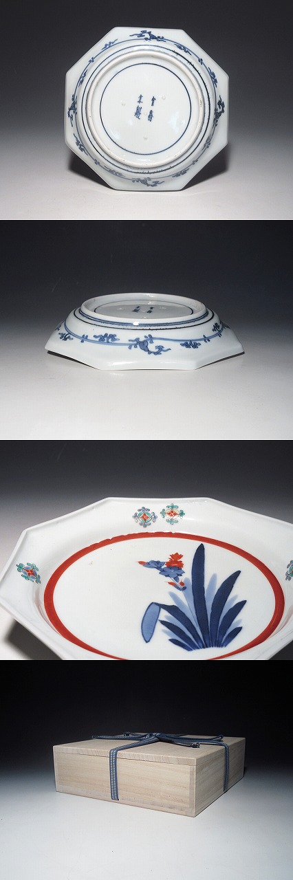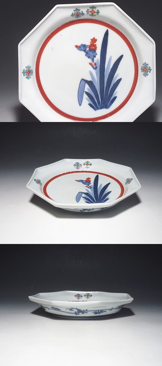 圏線の太い赤線が効いています。また、柿右衛門作品では、盛期作品の一部を除いて、面取皿は、あまり見かけ