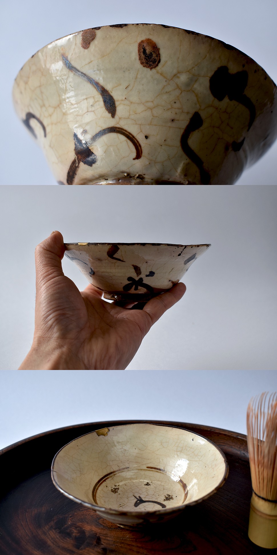 口縁に金繕い、時代ニュウと口縁に釉ムケが見られます。これらはほぼこの状態で長らく時間が経過しており特に気になるレベルではないと思います。
