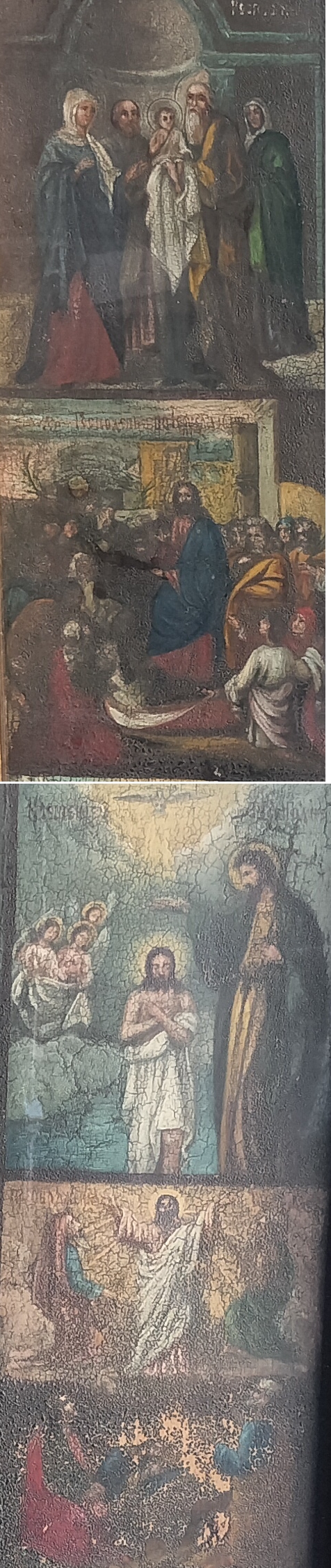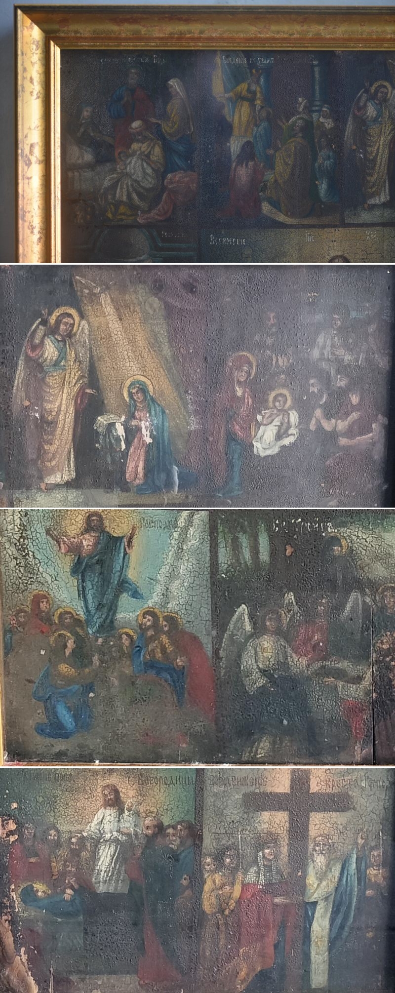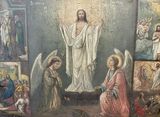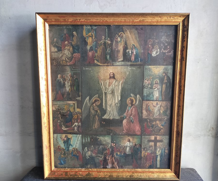 中央に立つ復活のキリストを中心に、イエスの生涯が周囲に場面ごとに描かれています。50cmを超えるサイズでとても迫力があり、家庭用というよりも教会などの広い空間で用いられていたことが想像されます。下部中央に欠損はあるものの、彩色や細部はよく残っており、全体の印象を損なうものではありません。サイズと内容を考えると本来はもう少し評価されてもよい品ですが、今回は控えめな価格でご紹介しております。