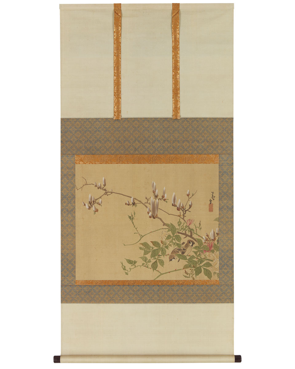 本作では、木蓮と薔薇のあいだに寄り添う二羽の雀が描かれています。輪郭線に頼らず筆の抑揚のみで枝ぶりを描き出す手法は、簡潔でありながら卓抜。木蓮の蕾の静けさ、薔薇の棘の緊張、そして雀の無邪気な姿は画面に豊かなリズムを生み出します。蘆雪の自然への純粋な慈しみを瑞々しく今に伝える、格別の魅力を湛えた逸品です。 |