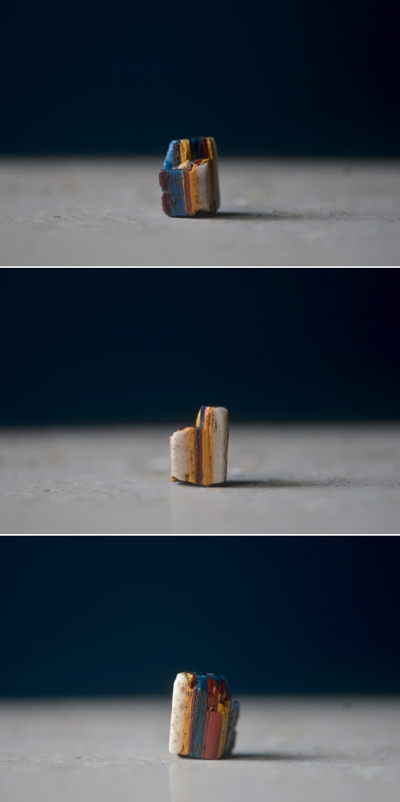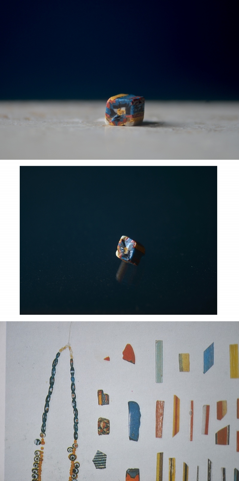 製作当時の色彩をよく伝えるモザイクガラスの残欠。1980年に東京国立博物館で開催された「東洋古代ガラス」展に出品された現品です。(写真最後)
