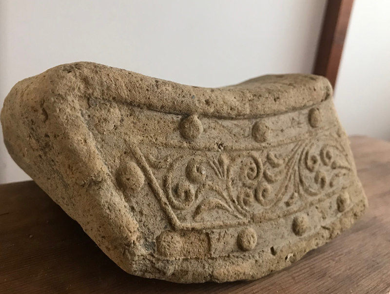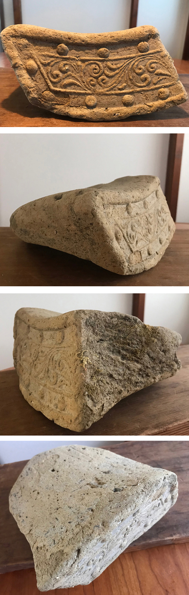 その量感から来る存在感、流水のように躍動する唐草模様の美しさ、そして、経年の風雨が育てた柔らかさ、温かみ、ほんとうに美しい古瓦です。